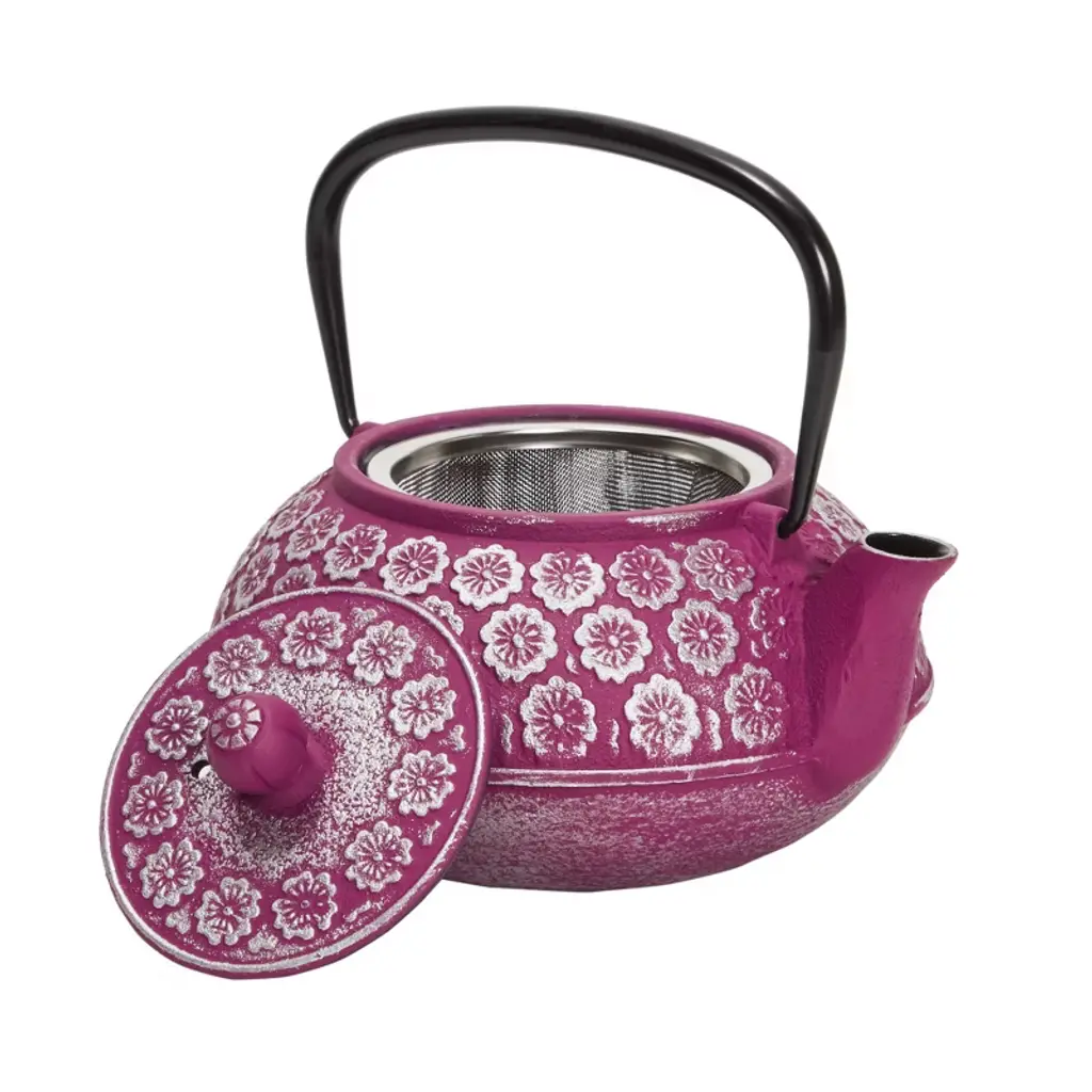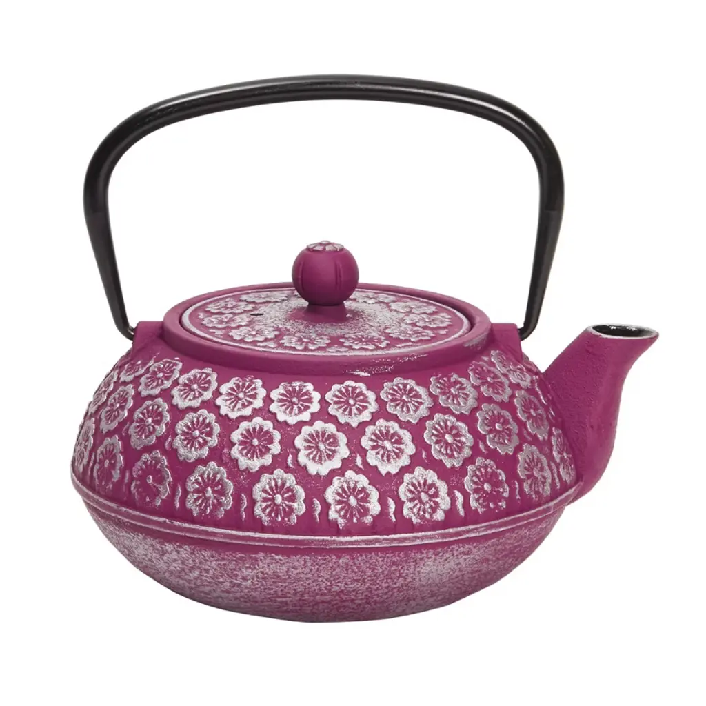 Juvale Purple Cast Iron Floral Teapot Kettle With Stainless Steel Infuser Set, Japanese Tea Pot For Kitchen Pantry, 34 Oz