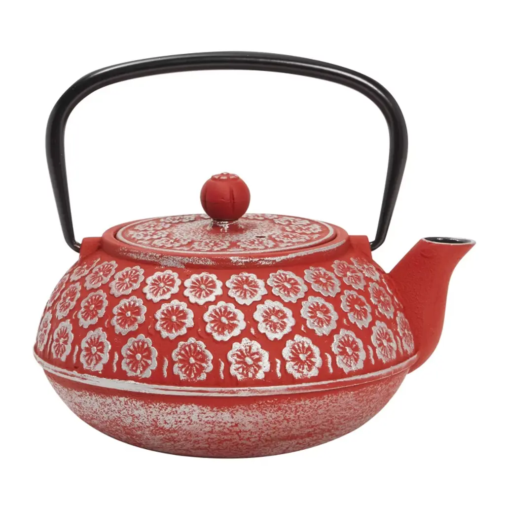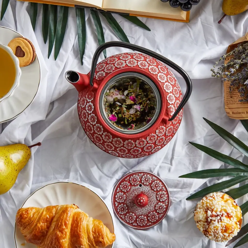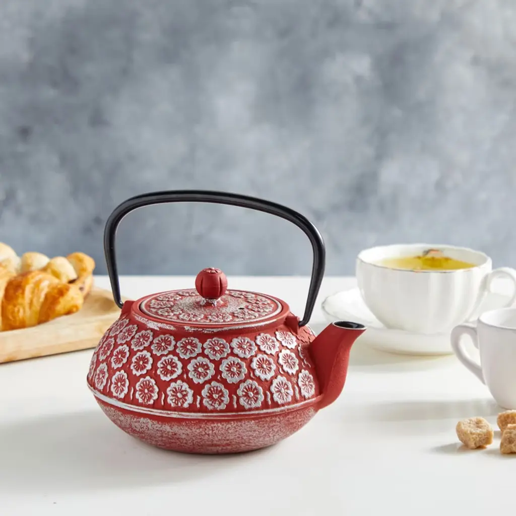 Juvale Red Cast Iron Floral Teapot Kettle With Stainless Steel Infuser Set, Japanese Tea Pot For Kitchen Pantry, 34 Oz