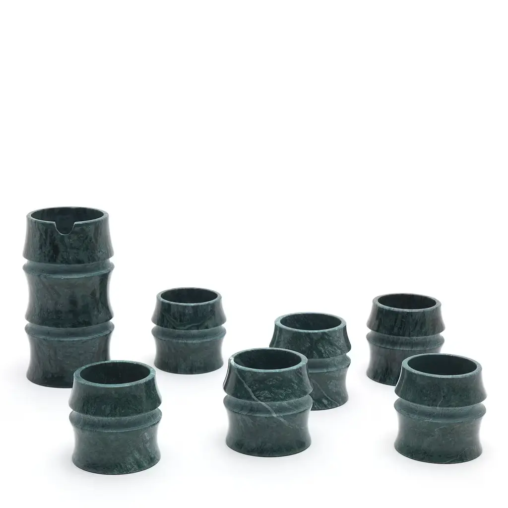 This precious tokkuri will make for a spot-on gift for Asian culture aficionados, especially if paired with the coordinated cups completing the sake set from the Kadomatsu series designed by Michele Chiossi. Its phytomorphic shape resembling a bamboo cane hints at a deceptive lightness, counterbalanced by the charming solidity of green Guatemala marble, which strikes with its characteristic green-toned veining and spontaneous elegance. Please note that marbles and stones are natural materials and they can differ also if coming from the same quarry or the same block. The product shown may differ from purchased items. Every piece is unique.