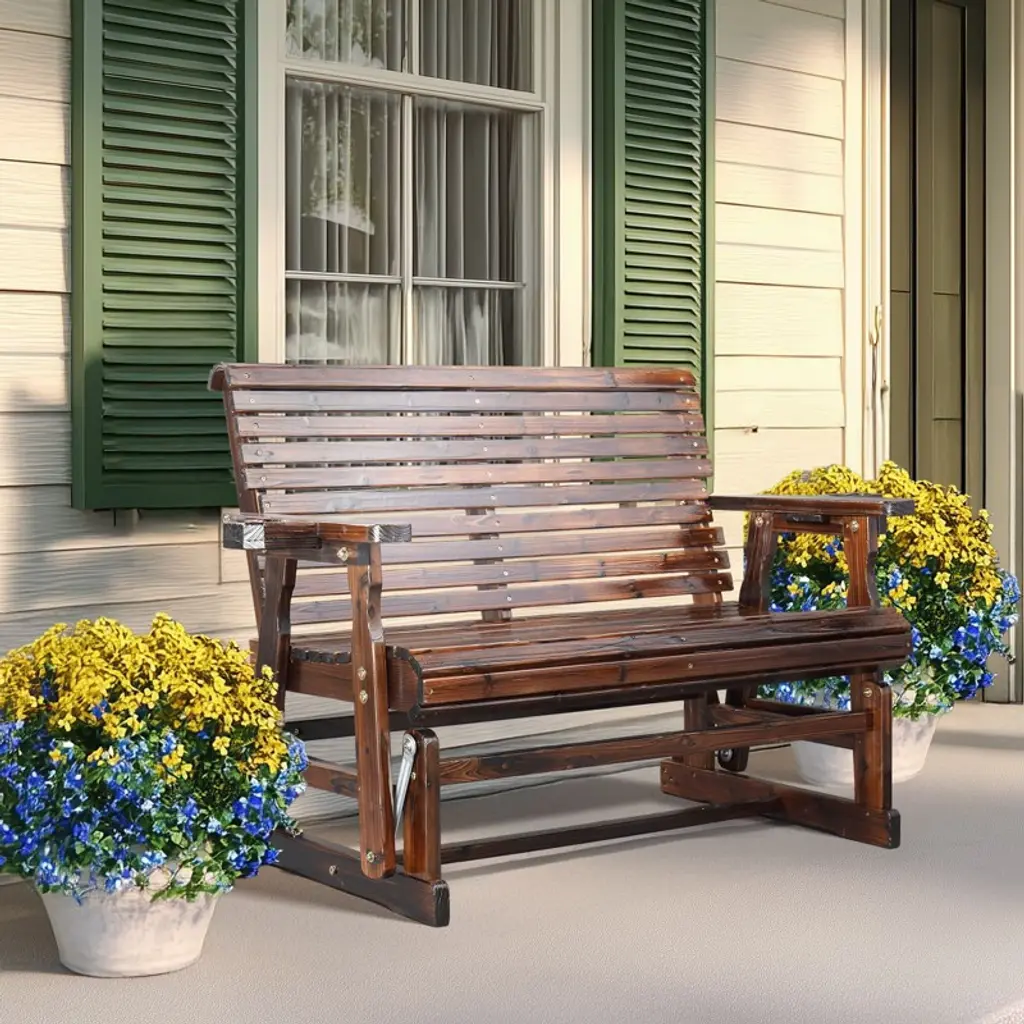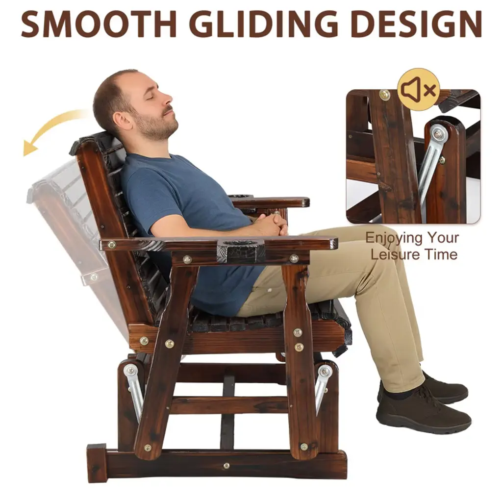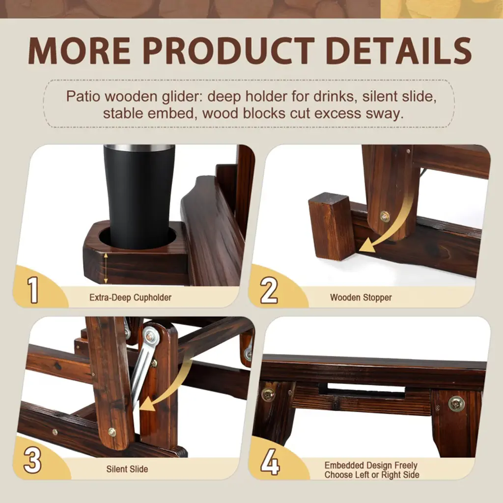 Elevate your outdoor leisure with this elegantly crafted glider bench, designed to blend seamless comfort with timeless style. Perfect for patios, porches, or gardens, this 2-seater glider offers a gentle, soothing rocking motion that invites relaxation under the sun or stars. Constructed from durable fir wood with a rich teak finish, it combines sturdy craftsmanship with a weight capacity of 801 lbs, ensuring long-lasting use for you and a companion. The ergonomic design features an extended backrest, spacious seat, and a built-in cup holder, making it the ultimate spot to unwind with a refreshing drink while soaking in nature’s tranquility.