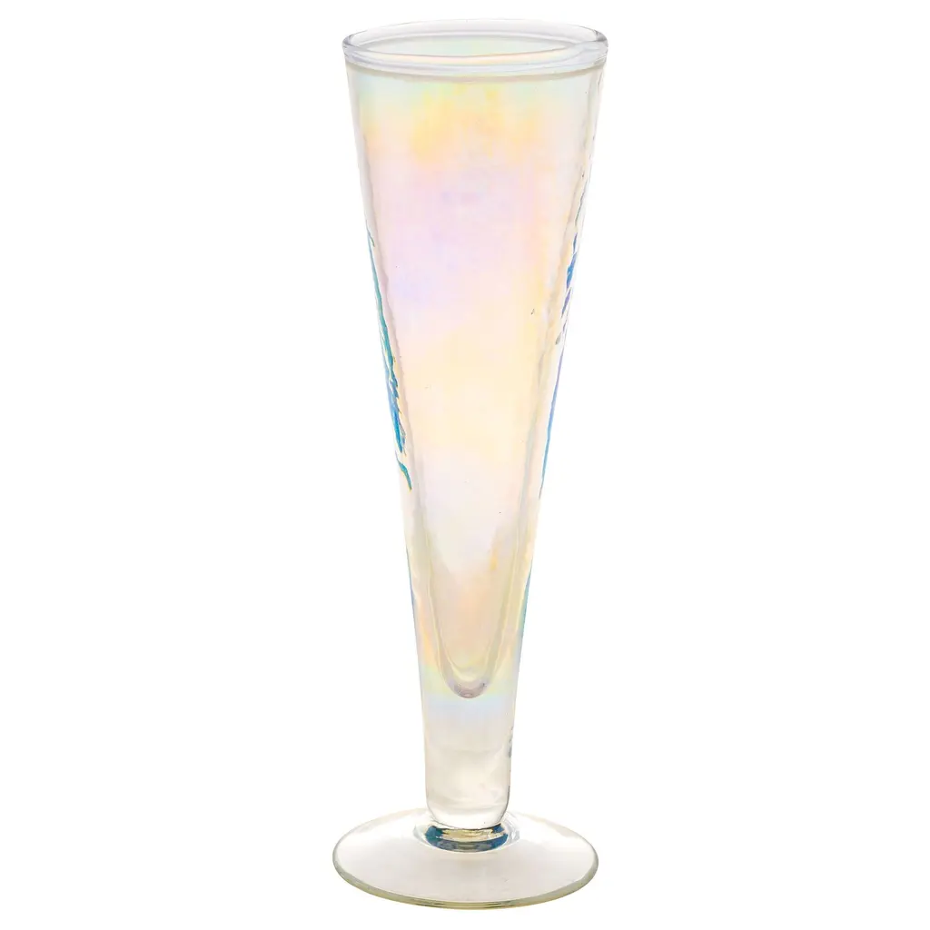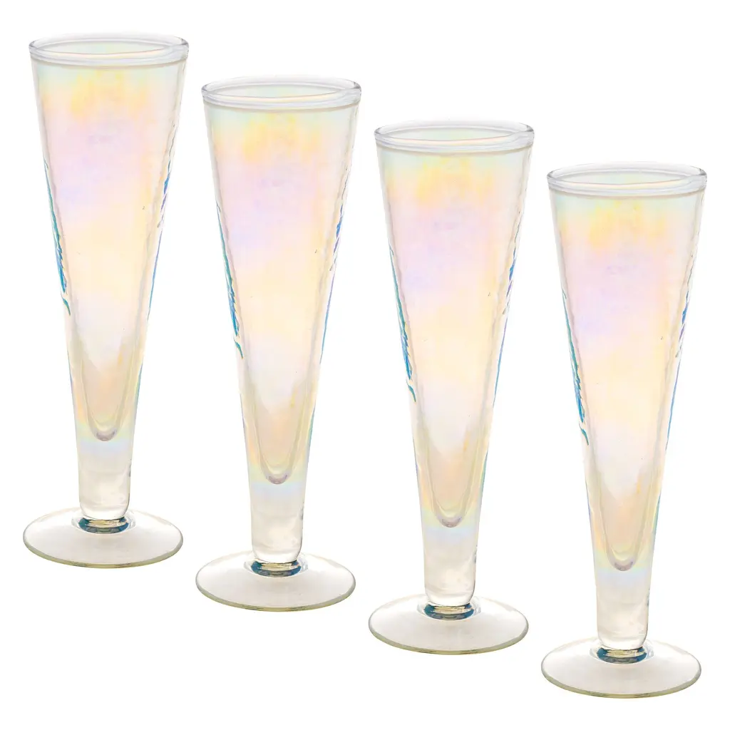 Drink in style with our trendy glass drinkware! Add a pop of color to your glassware and get a full set to make your kitchen complete. These Champagne flutes are versatile and sure to add some decoration to any table or cabinet. They are food safe and available in five different iridescent glass colors.Details Set of 4 Food safe Dimensions Approx. 8.25” Approx. 6.4 oz. Material GlassCare Tips Hand wash