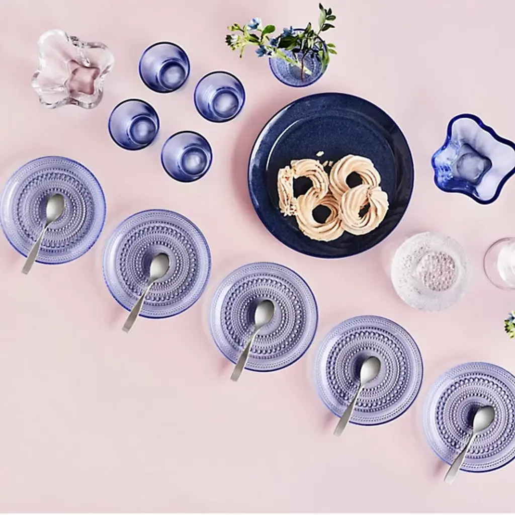 The Iittala Kastehelmi Small Plate has a lacy look and a bubbly texture courtesy of hundreds of glass droplets. This lovely decorative technique was originally devised by Oiva Toikka back in 1964 as a way to hide the seams of pressed glass. Lovely on its own or as a dewy accent to other dinnerware.