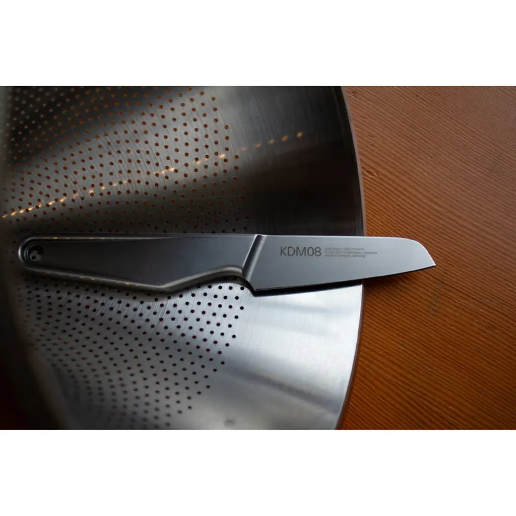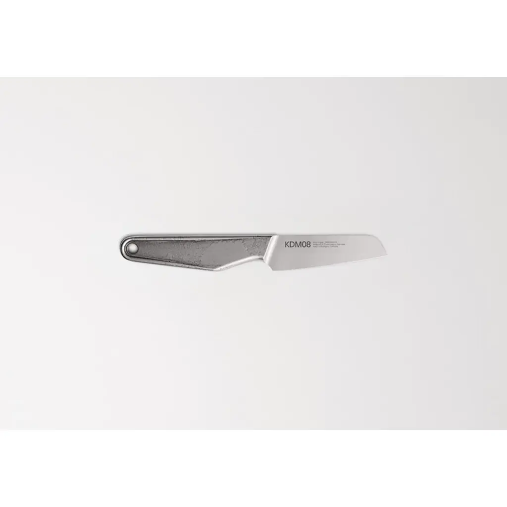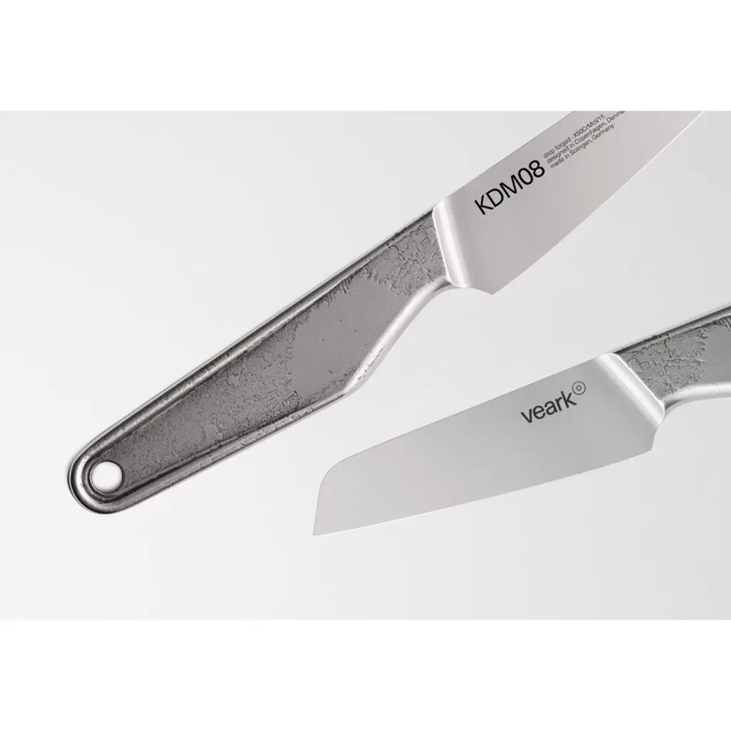 The Veark KDM08 is a Japanese-style Kudamono knife, ideal for chopping small vegetables, chili, garlic and other tasks that require precision. The straight blade shape allows for controlled, accurate cuts, making it a reliable tool for detailed kitchen work. Crafted from high-quality German steel, the KDM08 knife is forged from a single piece of metal, making it seamless, easy to clean and exceptionally durable. The handle’s open design, inspired by a wrench, allows for a secure grip close to the blade’s center of gravity, improving precision and balance. The surface of the handle features a unique texture created by drop forging, giving each knife its own distinctive character. Built to last for generations, Veark knives are made in Solingen, Germany – a town renowned for its centuries-old knife-making tradition.