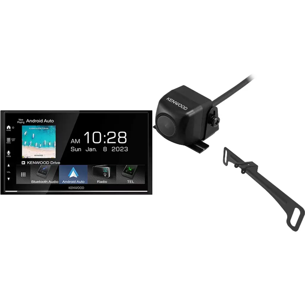 Enhance your driving experience with this comprehensive bundle featuring a Kenwood CMOS-230LP Rearview Camera and a Kenwood DMX129BT MultiMedia Receiver! The rearview camera provides crystal-clear images with a 128° perfect view angle, waterproof rating, and wide-angle mirror image. It's ideal for parking in any conditions. The camera unit boasts a 1/3.6" colour CMOS sensor, wide-angle lens, and high sensitivity pixels. The general specifications include dimensions of 23.4 x 23.4 x 23.9mm and an operating temperature range of -30°C to 70°C. The bundle also includes license plate mounting hardware for easy installation. The Kenwood DMX129BT MultiMedia Receiver offers a capacitive touch panel with swipe functionality, Android USB mirroring for app display and control, and 13-band EQ with digital time alignment for optimal tuning enhancements. Enjoy true mirroring via USB, 2-way touch control for Android, and a 6.8" WVGA monitor for immersive viewing. With built-in Bluetooth, rearview camera input with parking guidelines, and 2 preouts 2V with subwoofer out, this receiver delivers exceptional sound quality and connectivity. It has a maximum power of 45Wx4 and installation dimensions of 182 x 112 x 75 mm. Elevate your car's audiovisual system with this top-notch bundle!