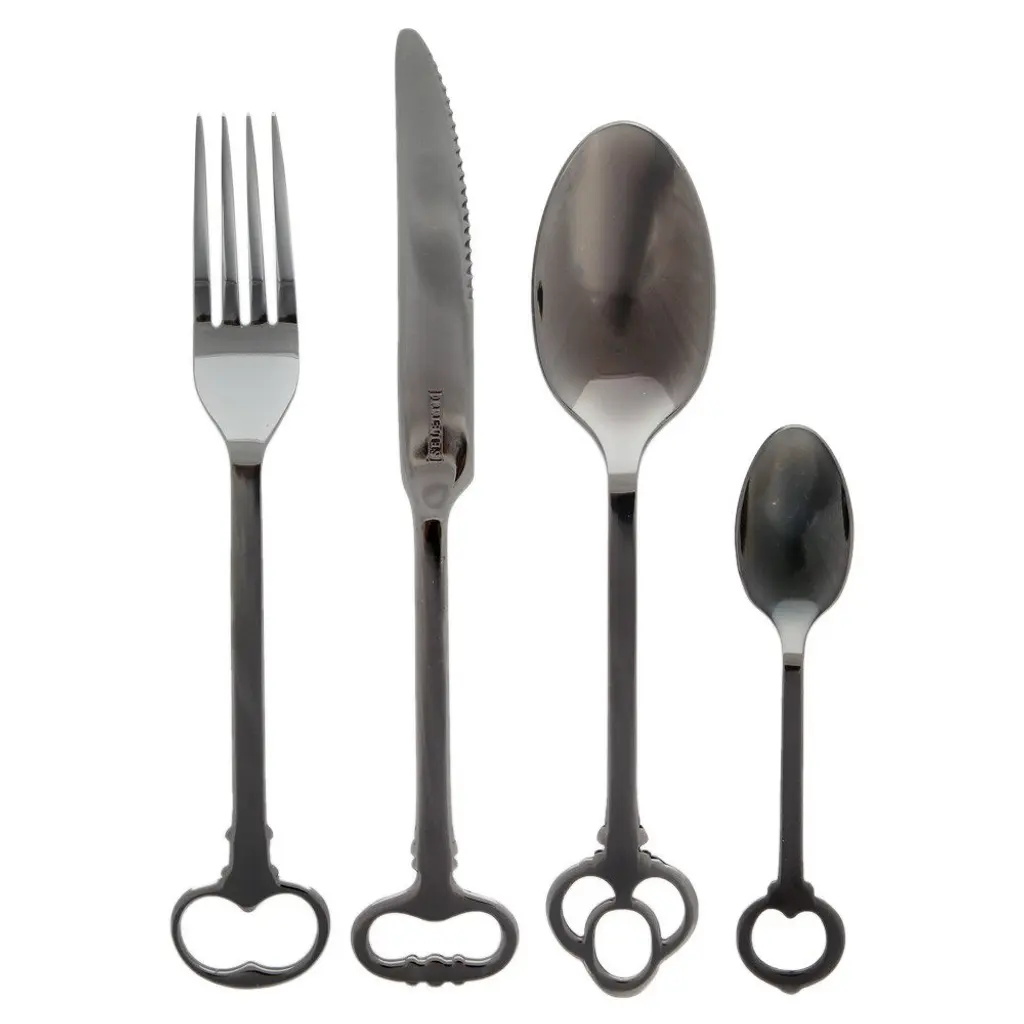 The key to memorable designs lies in creativity. The striking Keytlery Flatware Set designed by Alessandro Zambelli for iconic Italian brand Seletti illustrates this perfectly. Inspired by keys, the set features four types of handles, for each kind of cutlery: spoon, fork, knife and teaspoon. An ideal way to add a whimsy accent to a table setting and to transform everyday dining into a special event. This set can be used with simple plates or paired with artistic designs from the Seletti collection. Made of 18/10 stainless steel, the 24-piece set comes with an electroplated titanium finish that ensures more durability and corrosion resistance. Dishwasher safe, for more convenience.