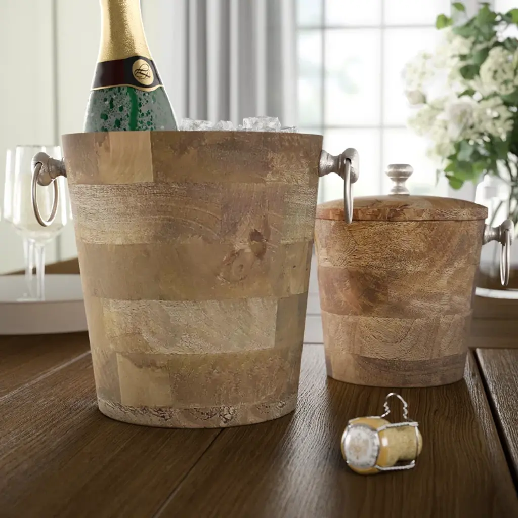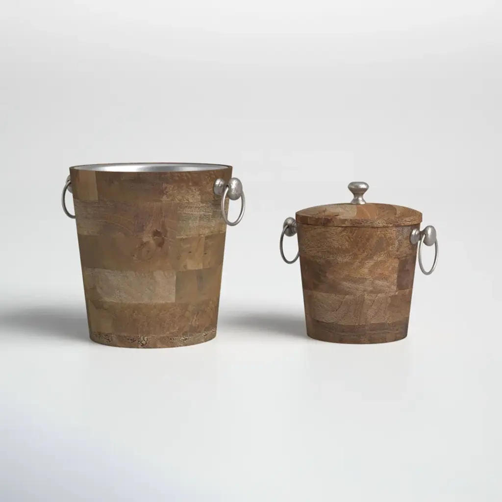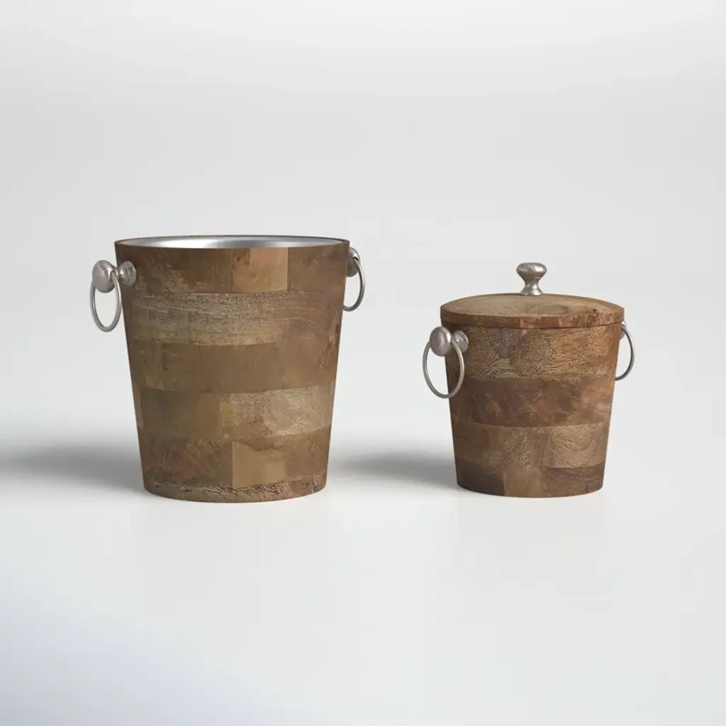 Safely store your favorite party-ready beverages with a set of 2 bar buckets. These buckets are designed with convenient handles and are made from a unique blend of mango wood and iron. Use these buckets to keep your drinks cold all year long.