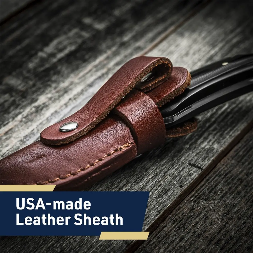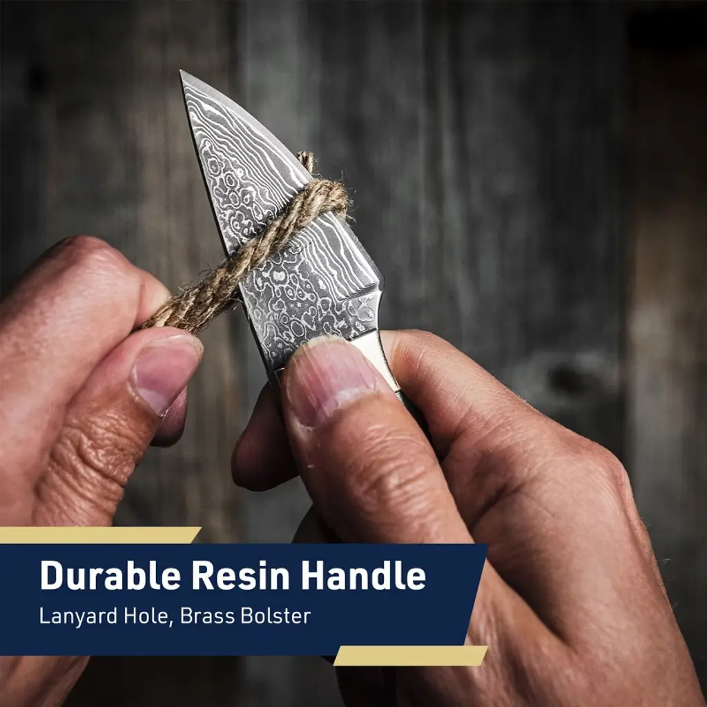 Sleek style and practical functionality combine in the Mini Fixed Damascus Blade Knife by Kings County Tools. This contemporary version utilizes a traditional folding technique to strengthen the metal, creating a blade that is beautiful, extra tough, and super sharp. These collectors' knives feature blades with their own unique pattern of waves and whorls, creating a one-of-a-kind design, but unlike some decorative knives for men, these fixed blade knives are also fully functional. The stainless-steel blade is just over 2-inches-long, while the durable resin handle measures 3.25-inches-long, with a lanyard hole and a brass bolster. When not in use, you can store the small utility knife in its USA-made leather sheath, which features a belt loop convenient for everyday carry.