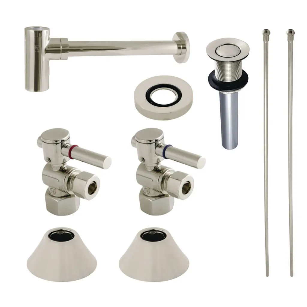 This contemporary style vessel sink kit (with overflow hole) consists of all the components necessary to install a wastewater draining system. The parts included are single handle 1/2" IPS angle stops, 30" bullnose lavatory supply lines, 1/2" IPS bell flanges, a 13-7/8" bottle-trap, mounting ring, and a 22-gauge push-button drain without overflow hole. Constructed of high-quality material and a tarnish-resistant finish, designed for long-lasting performance. Available in a variety of stunning finishes ready to match any home decor.Kingston Brass CC4310.DLVKB30 Features:Kingston Brass CC4310.DLVKB30 Specifications: