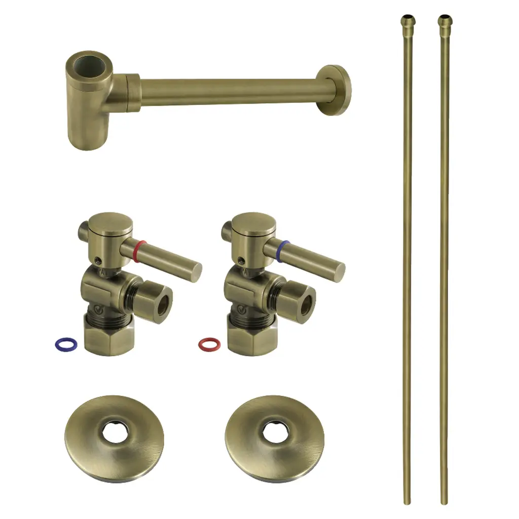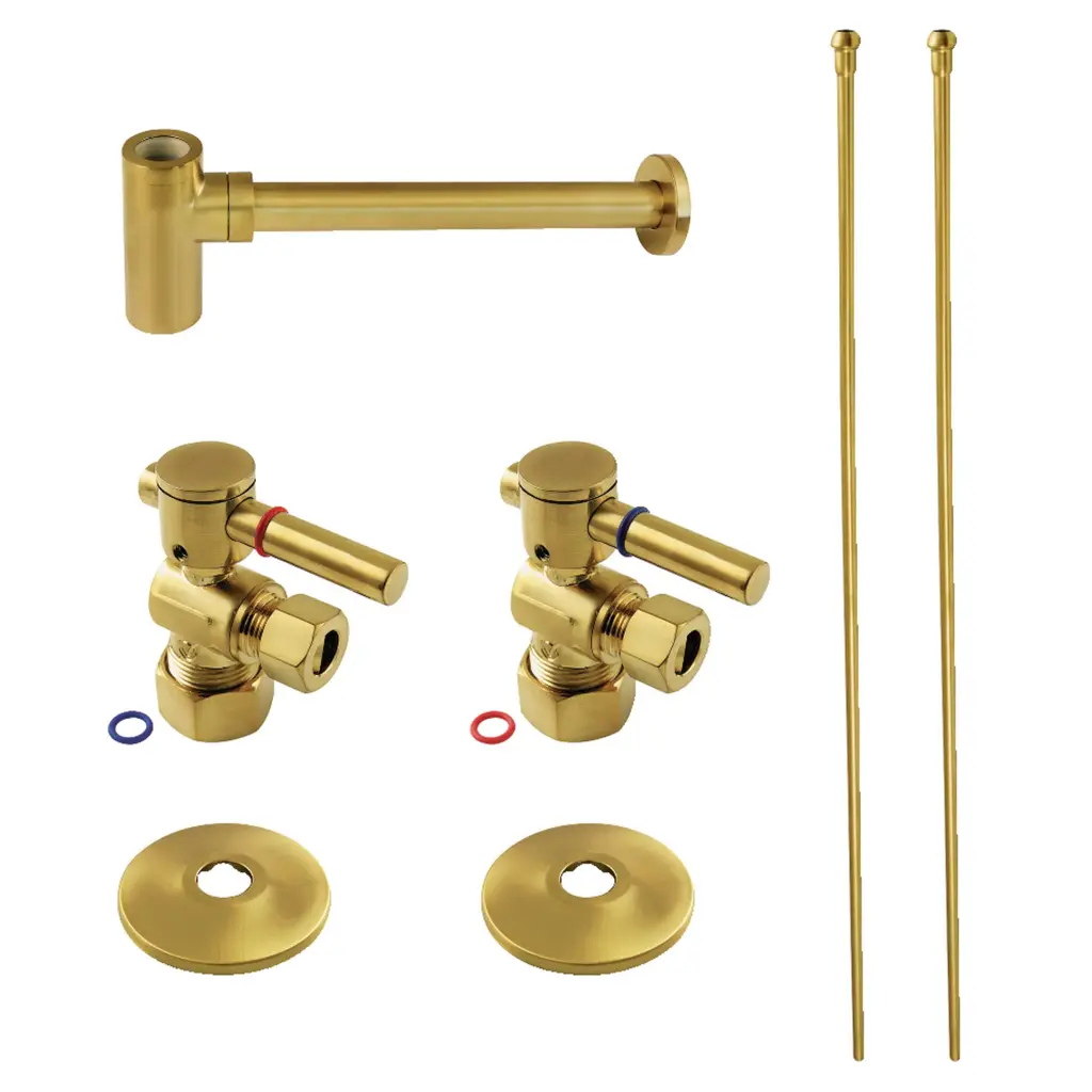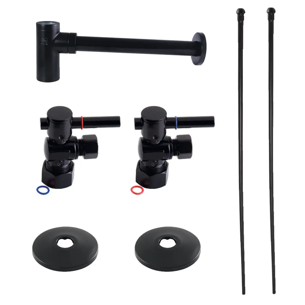 This 7-piece console sink plumbing kit from Kingston Brass provides all the necessary parts to elegantly finish the installation of your console sink. The set includes two 5/8" O.D. comp x 3/8" O.D. , comp quarter turn angle stop valves, two low profile flanges, two pieces 3/8" x 30" bull nose rigid supply lines, one modern bottle style p-trap with flange and angle stops include modern lever handle. Constructed of high quality brass and a tarnish-resistant finish, designed for long-lasting performance. Available in a variety of stunning finishes ready to match any home decor.FeaturesSolid brass constructionSupply and p-trap plumbing trim kit for bathroom sinksKit contains: 2 angle stops, 2 wall flanges, 2 supply lines, 1 p-trap, 1 p-trap wall flangeAngle stops designed to fit 1/2" (Nom) copper pipe (Compression fitting)Angle stop inlet is 5/8" O.D. compression (compression slip fit)Angle stop outlet is 3/8" O.D. compression (compression slip fit)Angle stops include modern lever handleIncludes (2) 2-7/16" low profile flanges to cover any unsightly holesTwo pieces 3/8" x 30" bull nose rigid supply linesOne modern bottle style p-trap with flangeP-trap is 1-1/4" diameter for bathroom sink drainsP-trap measures 12-13/16" from drain inlet center to wall-end
