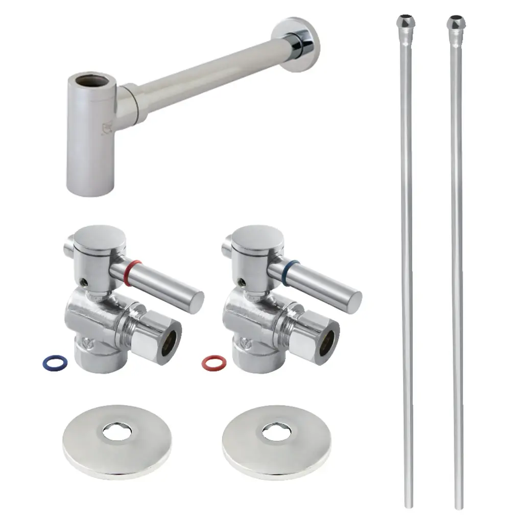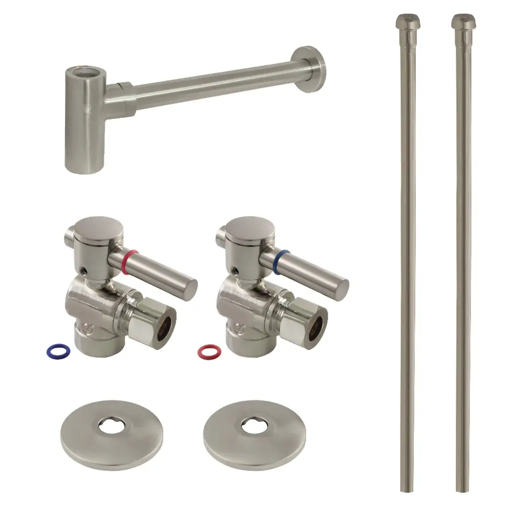 This 7-piece console sink plumbing kit from Kingston Brass provides all the necessary parts to elegantly finish the installation of your console sink. The set includes two 1/2 sweat inlet x 3/8" O.D. comp quarter turn angle stop valves, two low profile flanges, two pieces 3/8" x 30" bull nose rigid supply lines, one modern bottle style p-trap with flange, and angle stops include modern lever handle. Constructed of high quality brass and a tarnish-resistant finish, designed for long-lasting performance. Available in a variety of stunning finishes ready to match any home decor.FeaturesSolid brass constructionSupply and p-trap plumbing trim kit for bathroom sinksKit contains: 2 angle stops, 2 wall flanges, 2 supply lines, 1 p-trap, 1 p-trap wall flangeAngle stops designed to fit 1/2" copper pipe stub-out (Sweat)Angle stop inlet is 1/2" sweat connection, requires soldering to complete connectionAngle stop outlet is 3/8" O.D. compression (compression slip fit)Angle stops include modern lever handleIncludes (2) 2-1/2" flanges to cover any unsightly holesTwo pieces 3/8" x 30" bull nose rigid supply linesOne modern bottle style p-trap with flangeP-trap is 1-1/4" diameter for bathroom sink drainsP-trap measures 12-13/16" from drain inlet center to wall-end