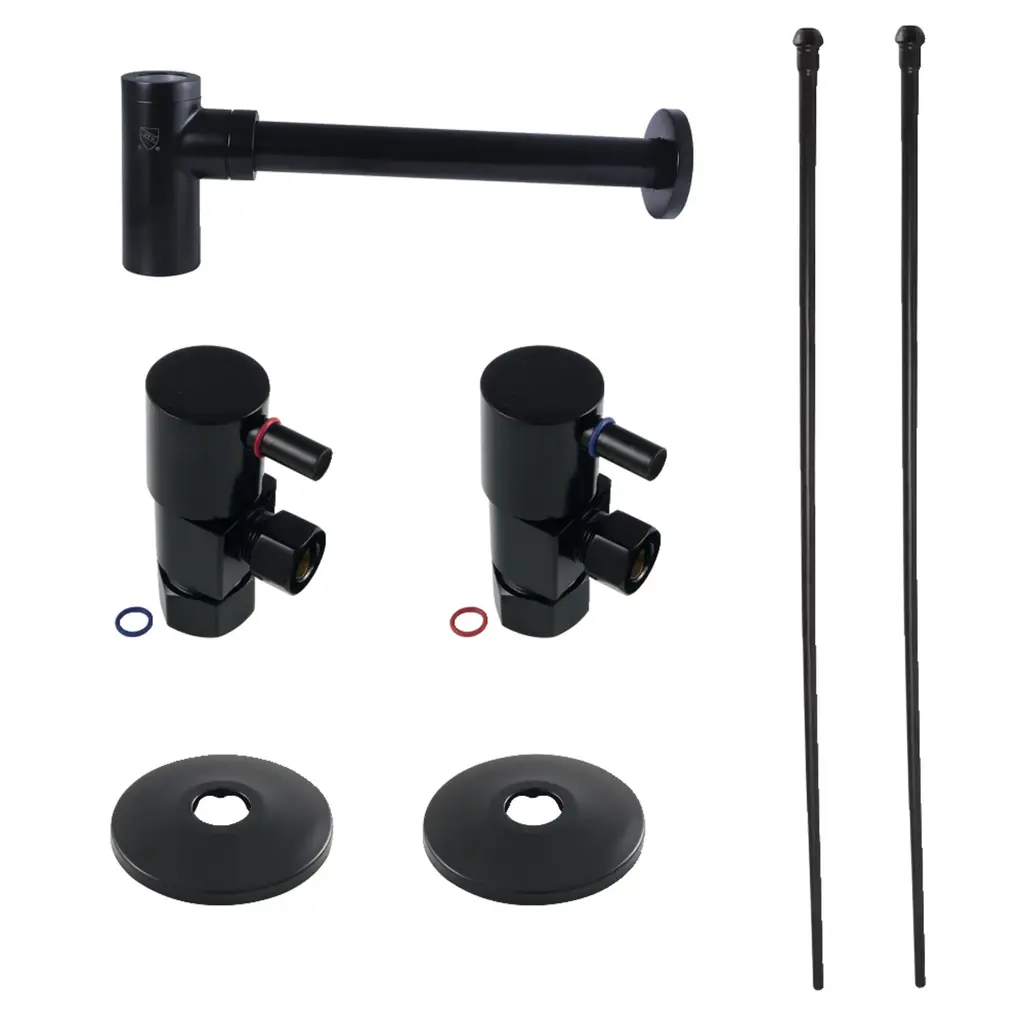 This 7-piece console sink plumbing kit from Kingston Brass provides all the necessary parts to elegantly finish the installation of your console sink. The set includes two 5/8" O.D. comp x 3/8" O.D. comp quarter turn angle stop valves, two low profile flanges, two pieces 3/8" x 30" bull nose rigid supply lines, one modern bottle style p-trap with flange, angle stops include modern lever handle. Constructed of high quality brass and a tarnish-resistant finish, designed for long-lasting performance. Available in a variety of stunning finishes ready to match any home decor.FeaturesSolid brass constructionSupply and p-trap plumbing trim kit for bathroom sinksKit contains: 2 angle stops, 2 wall flanges, 2 supply lines, 1 p-trap, 1 p-trap wall flangeAngle stops designed to fit 1/2" (Nom) copper pipe (Compression fitting)Angle stop inlet is 5/8" O.D. compression (compression slip fit)Angle stop outlet is 3/8" O.D. compression (compression slip fit)Angle stops include modern lever handleIncludes (2) 2-7/16" low profile flanges to cover any unsightly holesTwo pieces 3/8" x 30" bull nose rigid supply linesOne modern bottle style p-trap with flangeP-trap is 1-1/4" diameter for bathroom sink drainsP-trap measures 12-13/16" from drain inlet center to wall-end