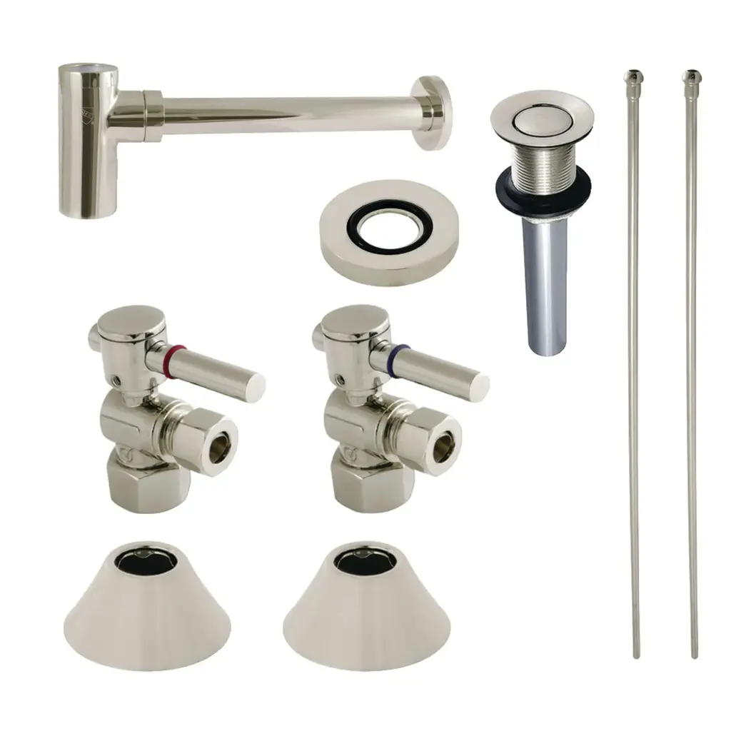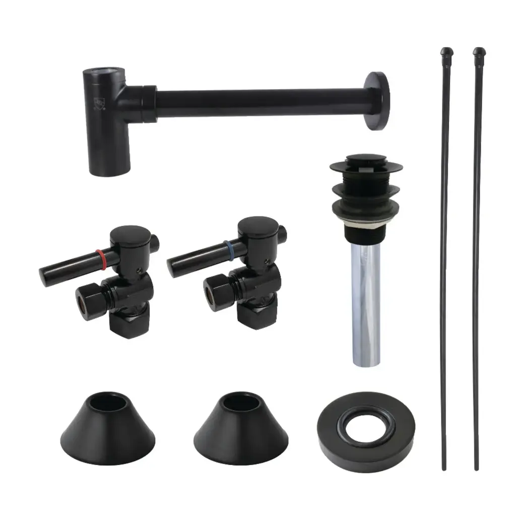 This contemporary style vessel sink kit (with overflow hole) consists of all the components necessary to install a waste water draining system. The parts included are single handle 1/2" IPS angle stops, 30" bullnose lavatory supply lines, 1/2" IPS bell flanges, a 13-7/8" bottle-trap, mounting ring and an 22-gauge push-button drain without overflow hole. Constructed of high quality material and a tarnish-resistant finish, designed for long-lasting performance. Available in a variety of stunning finishes ready to match any home decor.FeaturesTwo 1/2"-14 NPT inlet x 3/8" O.D. comp quarter turn angle stop valvesTwo high profile flangesTwo pieces 3/8" x 30" bull nose rigid supply linesOne modern bottle style p-trap with flangeOne "no overflow" drain and mounting ring kit for vessel sinkAngle stops include modern lever handle