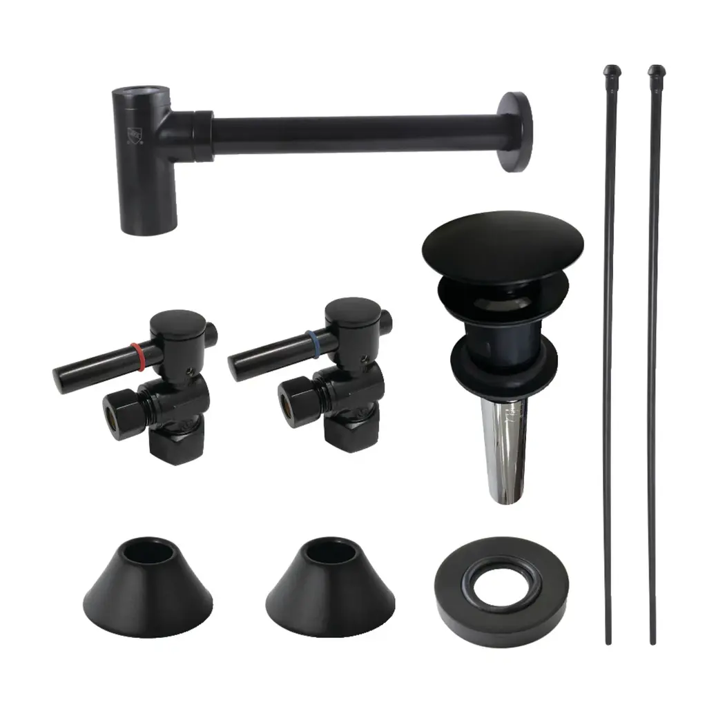This contemporary style vessel sink plumbing kit consists of all the necessary components for installing a waste water draining system. The parts included are single handle 1/2" IPS angle stops, 30" bullnose lavatory supply lines, 1/2" IPS bell flanges, a 13-7/8" bottle-trap and a drain with mounting rain. Constructed of high quality material and a tarnish-resistant finish, designed for long-lasting performance. Available in a variety of stunning finishes ready to match any home decor.FeaturesTwo 1/2"-14 NPT inlet x 3/8" O.D. comp quarter turn angle stop valvesTwo high profile flangesTwo pieces 3/8" x 30" bull nose rigid supply linesOne modern bottle style p-trap w/ flangeOne drain and mounting ring kit for vessel sinkAngle stops include modern lever handle