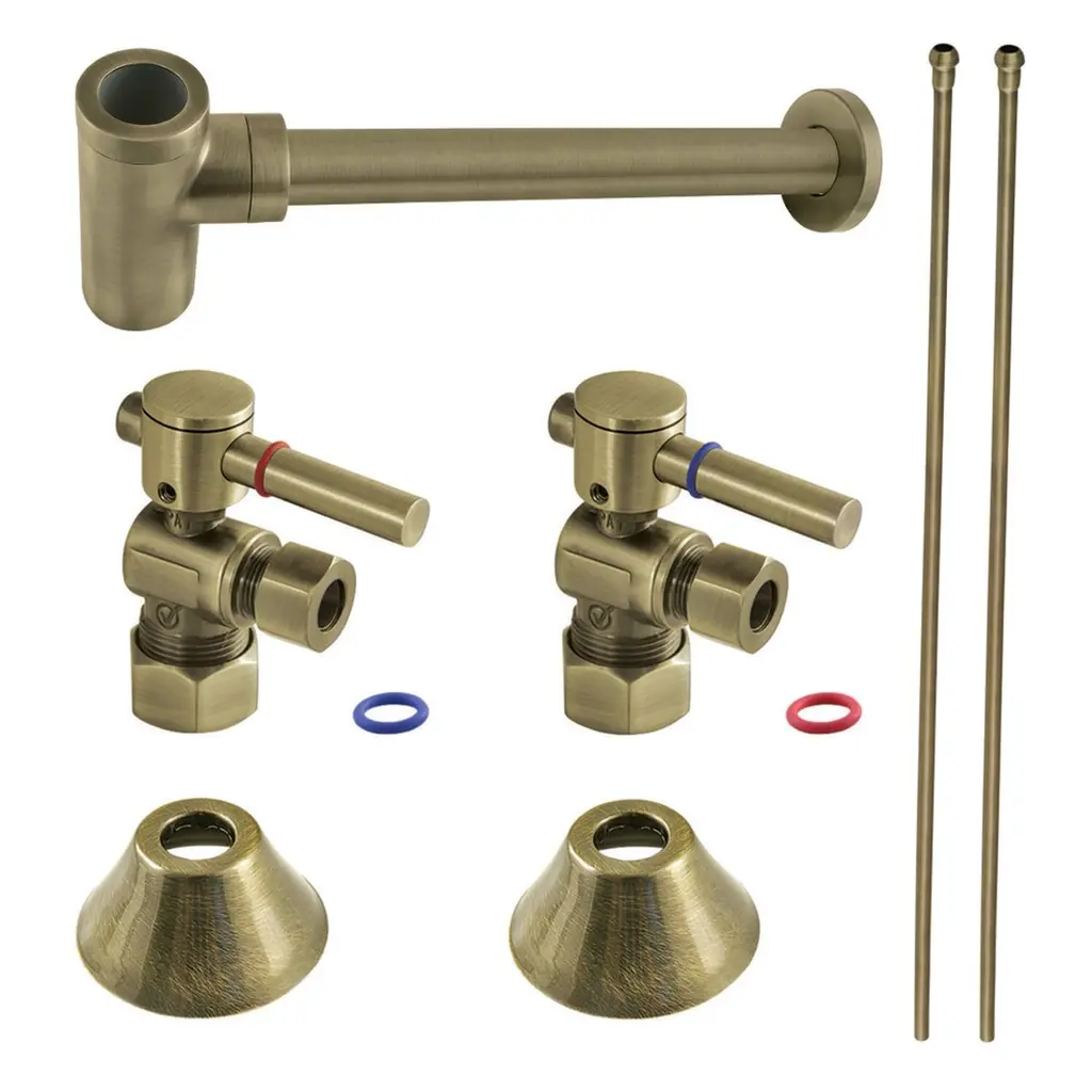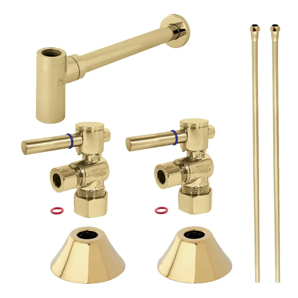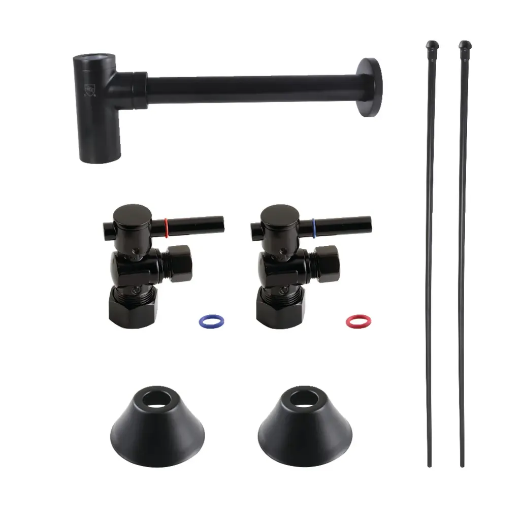 This contemporary themed lavatory/kitchen supply kit features all the components necessary for installing a sink water draining system. The items in this combo include compression angle stops, 30-inch bullnose lavatory supply lines, 1/2" IPS bell flanges, and a sleek 13-7/8" bottle trap. Constructed of high quality material and a tarnish-resistant finish, designed for long-lasting performance. Available in a variety of stunning finishes ready to match any home decor.FeaturesTwo 5/8" O.D. comp x 3/8" O.D. comp quarter turn angle stop valvesTwo high profile flangesTwo pieces 3/8" x 30" bull nose rigid supply linesOne modern bottle style p-trap with flangeAngle stops include modern lever handle