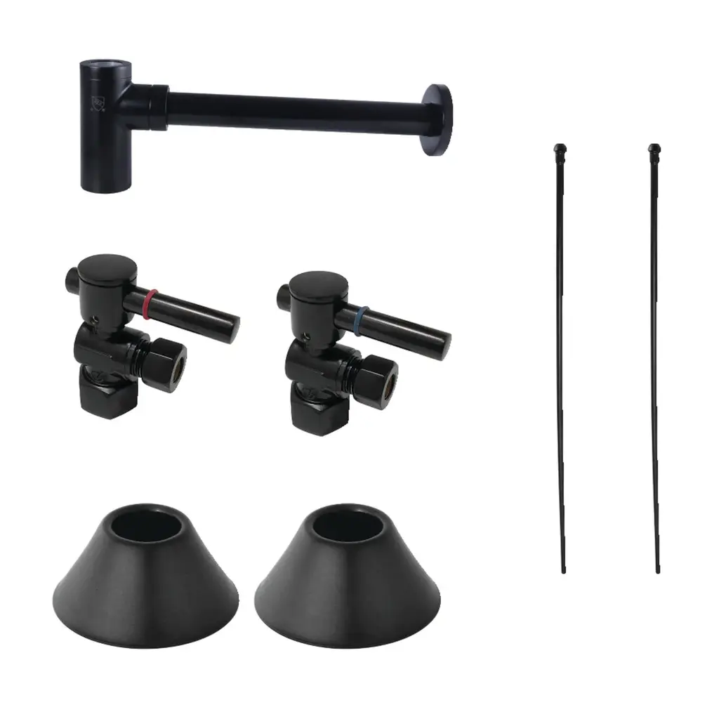 This contemporary themed lavatory/kitchen supply kit features all the components necessary to allow proper installation of the water drainage process. The items in this combo include 1/2-14 NPT x 3/8 O.D Comp. angle stops, 30-inch bullnose lavatory supply lines, 1/2 inch IPS bell flanges, and a sleek 13-13/16 inch bottle trap. Constructed of high quality material and a tarnish-resistant finish, designed for long-lasting performance. Available in a variety of stunning finishes ready to match any home decor.FeaturesTwo 1/2"-14 NPT inlet x 3/8" O.D. comp quarter turn angle stop valvesTwo high profile flangesTwo pieces 3/8" x 30" bull nose rigid supply linesOne modern bottle style p-trap with flangeAngle stops include modern lever handle
