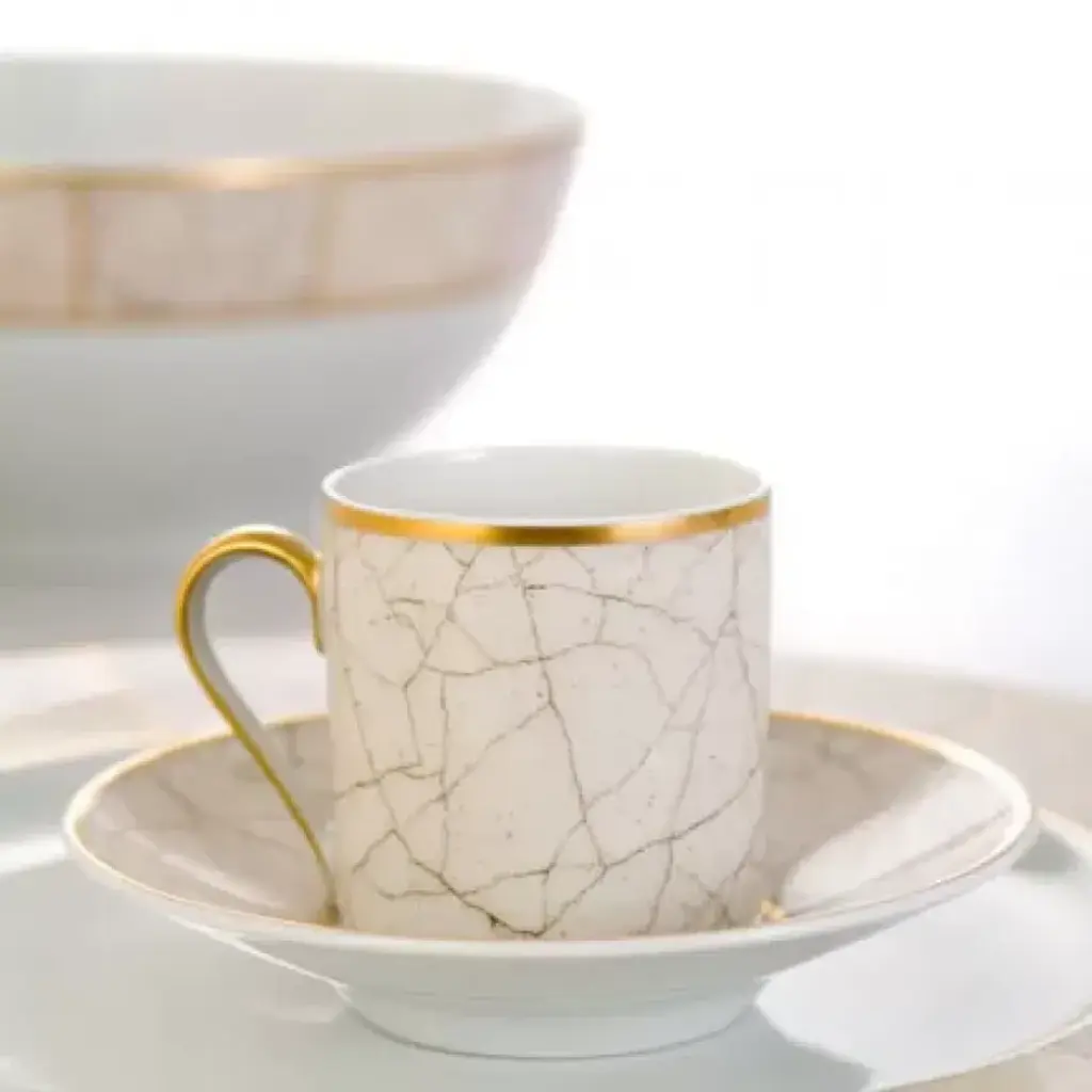 The artist Sarkis who designed this collection, is fascinated by this 16th century Japanese technique entitled--Kintsugi. The idea is to make visible repairs on fired ceramic using a mix of lacquer and gold. To complete the existing collection of gold trompe l'oeil on a pristine white background, Bernardaud is adding two new colors: Emperor Red and Coal Black. The red is deep, bold and textured - a highly complex color to master and reminiscent of the ancient lacquer finish; the coal black is solid and deep - mixed with gold, it adds an added touch of elegance and sophistication.