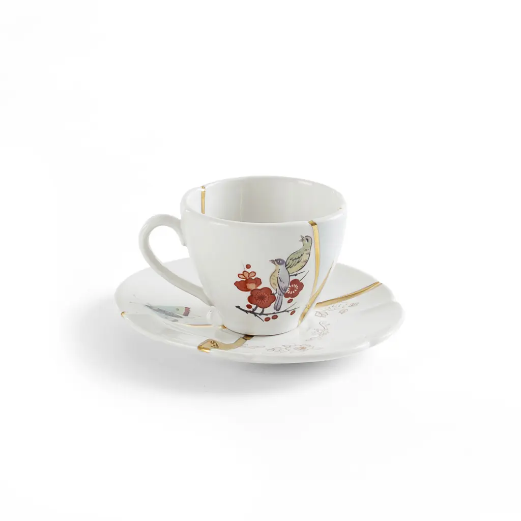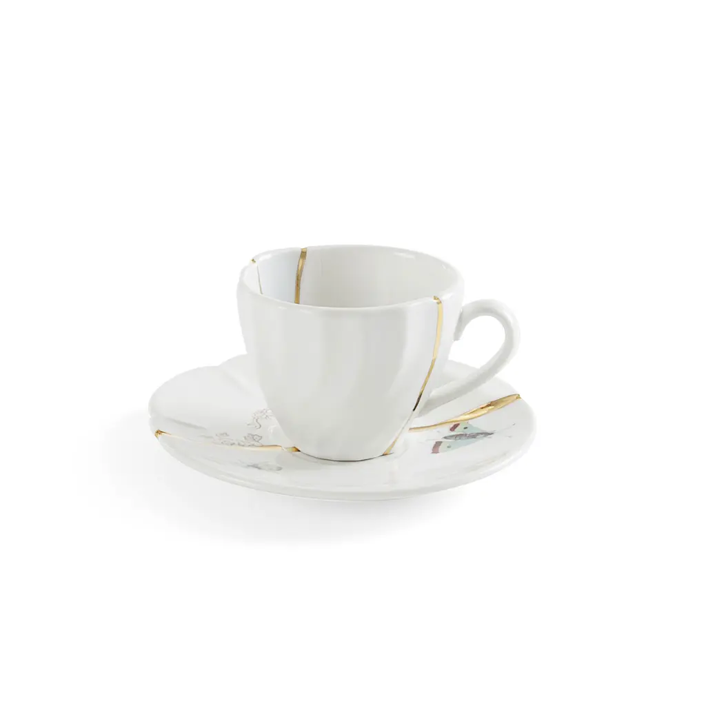 Avant-garde design in an artistic form, the Kintsugi collection displays Marcantonio Raimondi Malerba’s creativity and signature imaginative style. Made by iconic Italian brand Seletti, the Kintsugi collection brings an ancient Japanese technique to life in a (r)evolutionary design that expands upon the original concept. Traditionally, artisans glued broken pottery with a mixture of gold powder and lacquer in order to celebrate the beauty of imperfection as well as the history of the object. This Coffee Cup with Saucer features different pieces of fine porcelain connected in a unitary design via 24-carat gold lines. A masterpiece of modern design with roots in ancient tradition, the Kintsugi cup makes every coffee special.