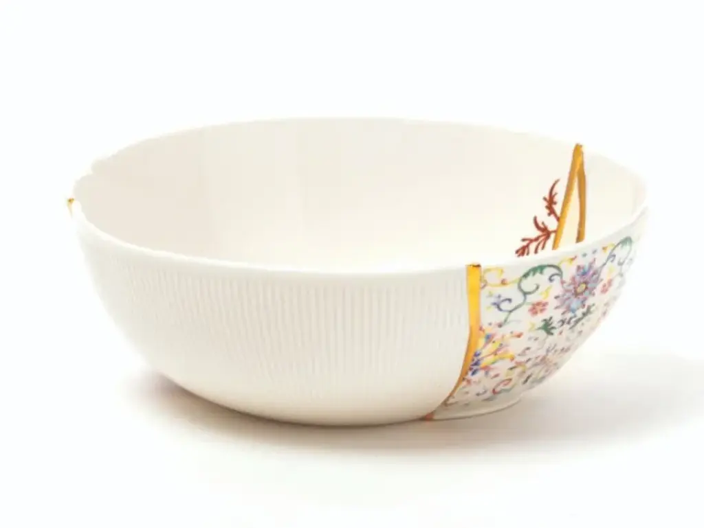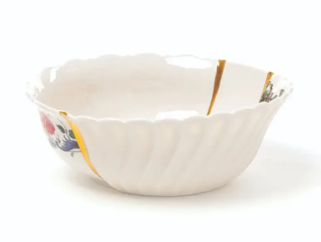 Salad bowl.‎Material: porcelain, goldDishawasher proofKintsugi Japanese art assumes contemporary shapes.‎ The delicate porcelaine is glorified and enriched with gold fragments for a tableweare collection made of charming and unexpected compositions.‎