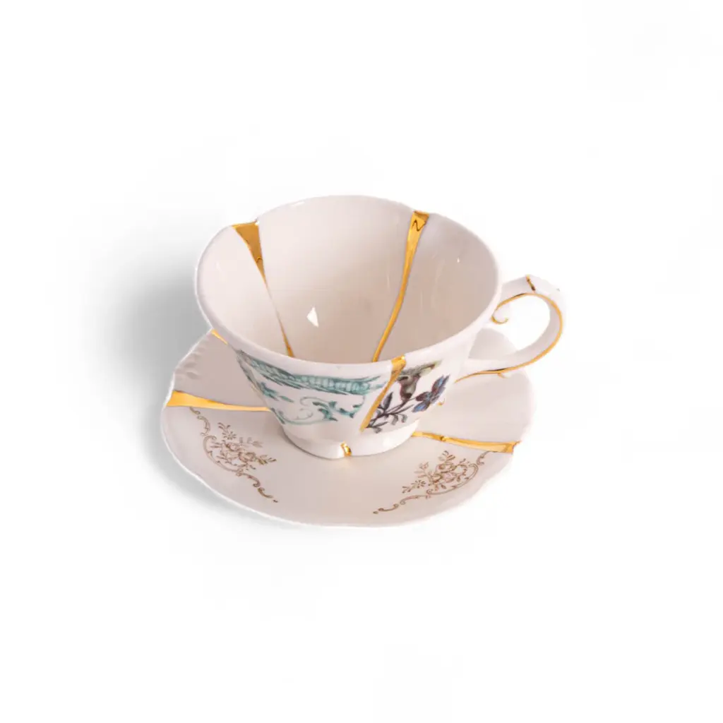 Elevate your tea time experience with the Kintsugi Tea Cup and Saucer from Seletti. Inspired by the traditional Japanese art, the delicate porcelain is adorned with gold fragments, creating a charming and unexpected piece. Perfect for those who appreciate art and sophistication, mix and match styles for a unique place setting paired with other pieces from the Kintsugi collection. Highlights