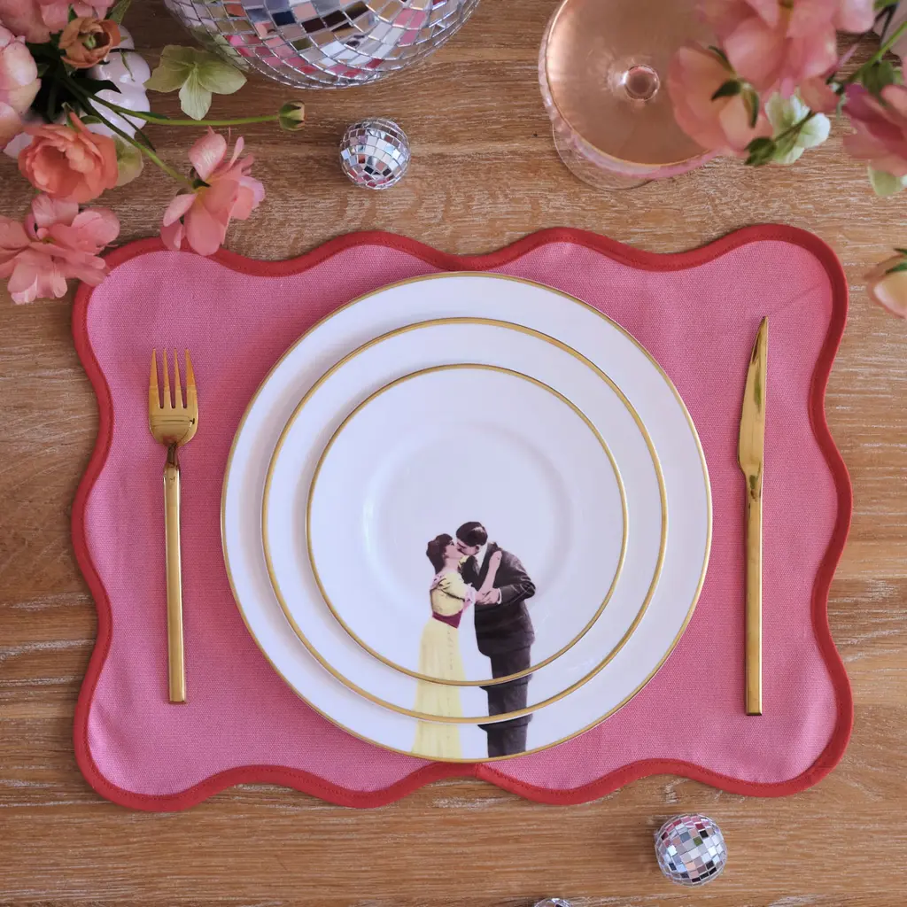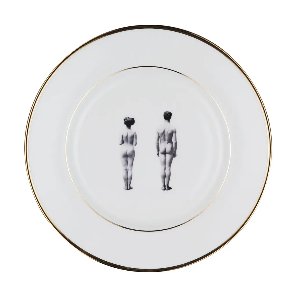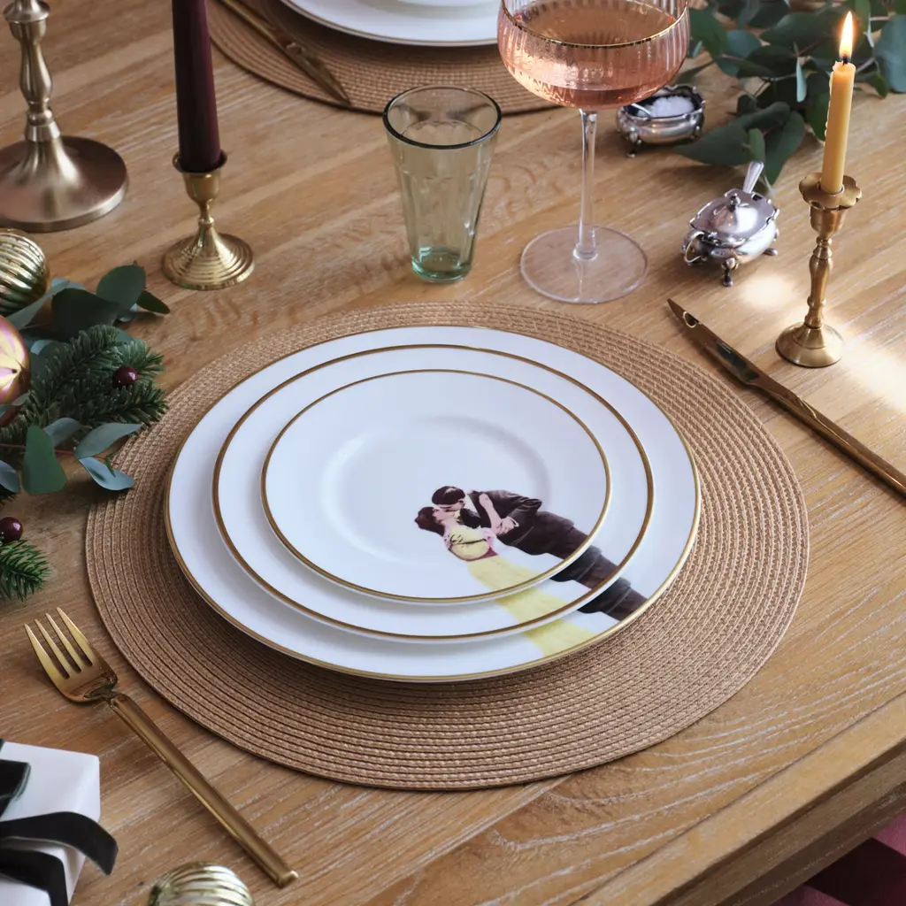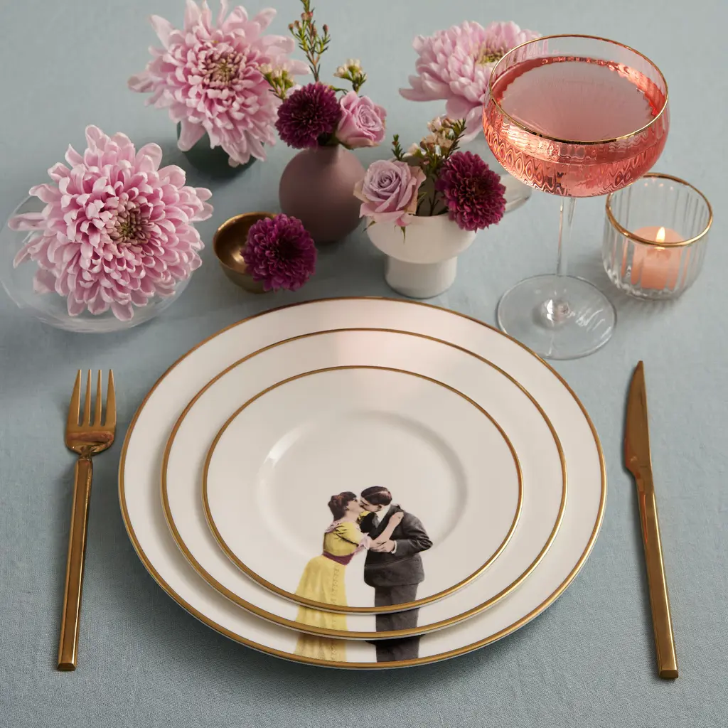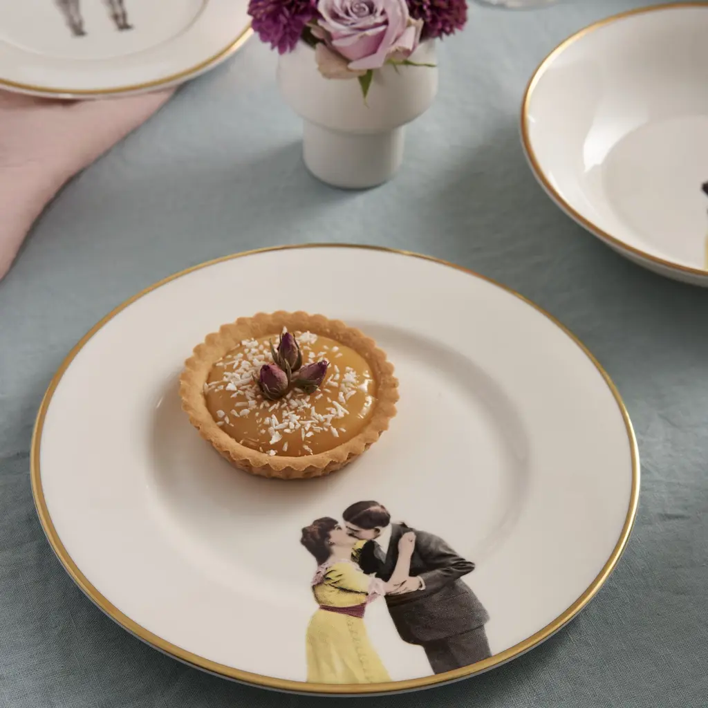 An exquisitely handcrafted fine bone china dessert/side plate with the Kissing Couple design, edged with hand painted 22kt burnished gold for a luxurious and dishwasher friendly finish.Featuring a romantic couple in an amorous embrace from the Melody Rose Modern Surrealist Collection. Perfect for any occasion, the plate makes a delightful gift or romantic wedding present. The Kissing Couple design is also available in larger lunch and dinner plates sizes. Wonderful on it’s own, as a set or mix, match and layer Melody Rose pieces to create your own unique set. Durable enough for every day use, the 22kt gilding and glorious detail also make them perfect for the grandest occasions.