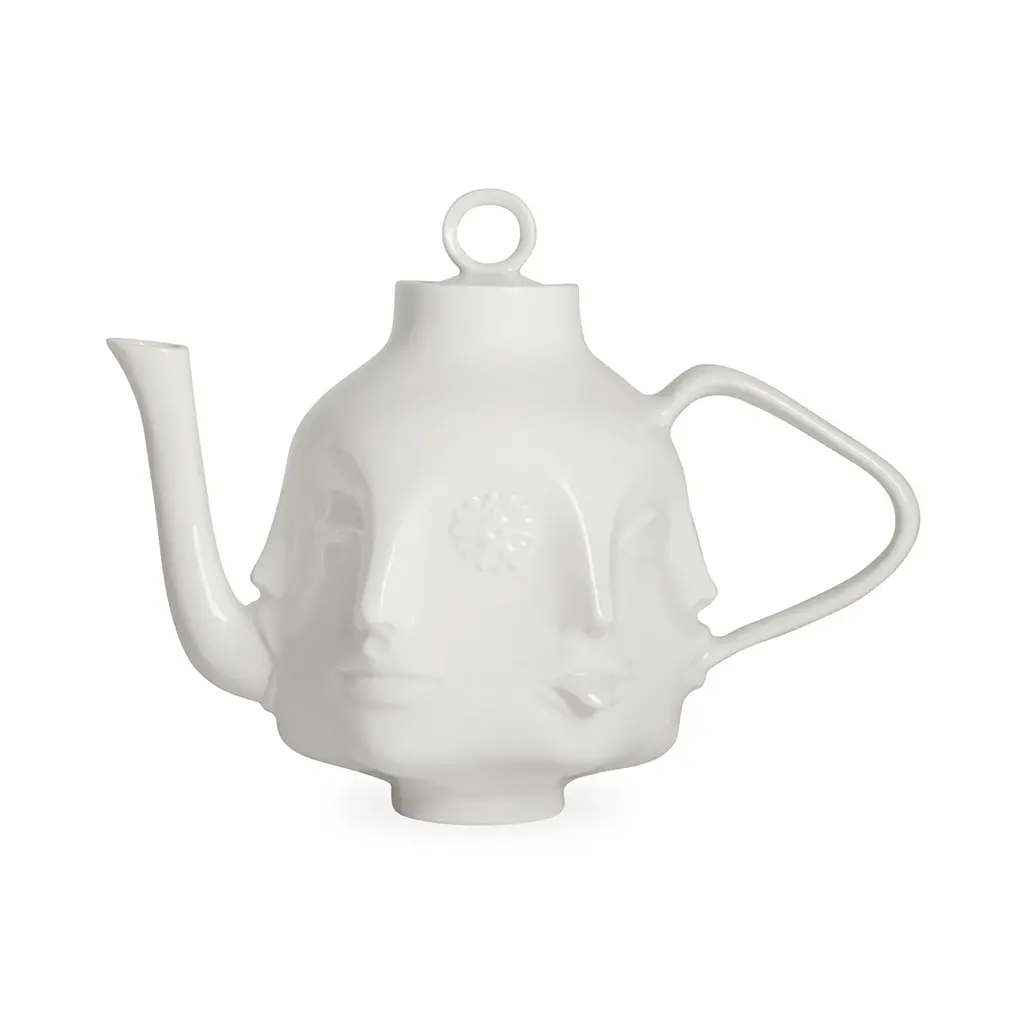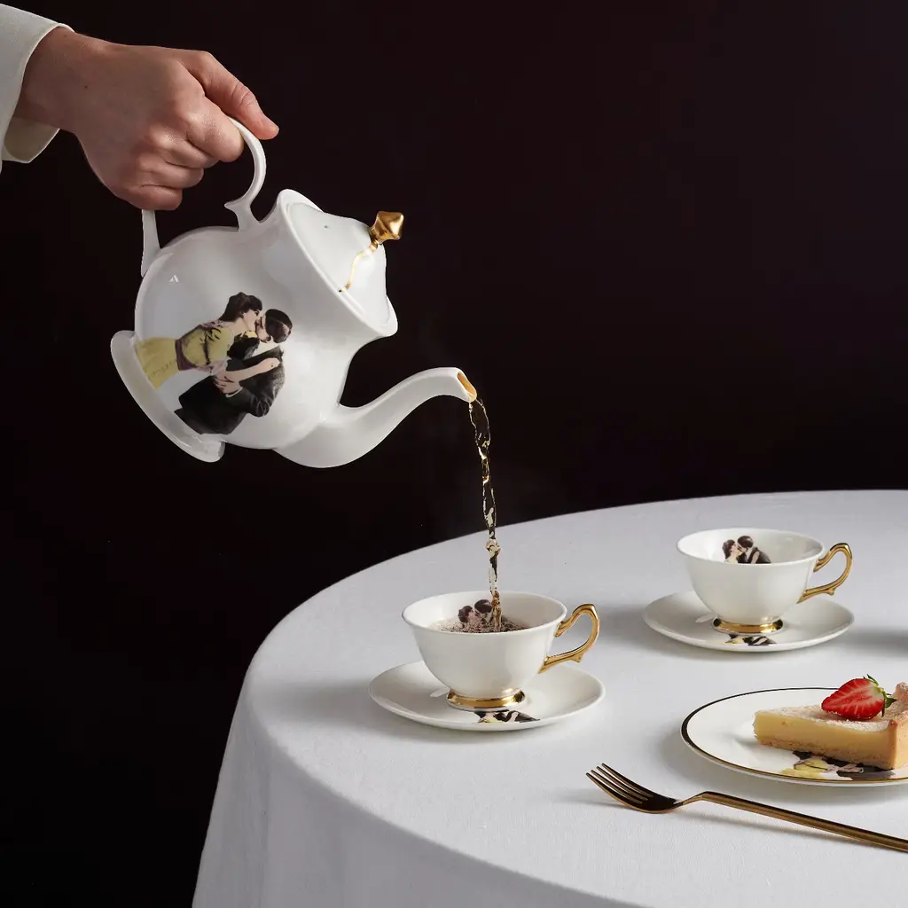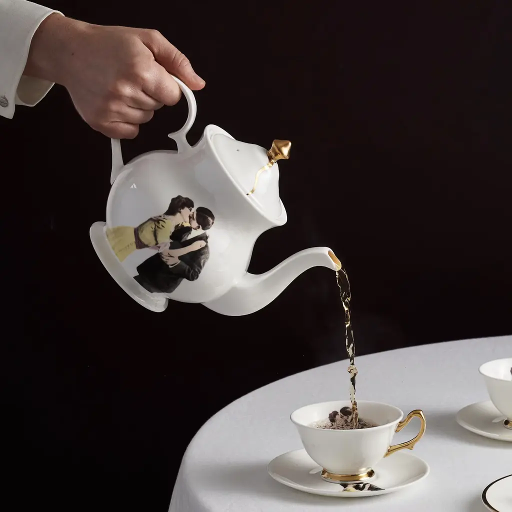 The Kissing Couple fine bone china teapot from the Melody Rose Modern SurRealist collection. Featuring a romantic couple in an amorous embrace and finished with hand painted 22kt burnished gold drip lid for a luxurious and dishwasher friendly finish. Perfect for any occasion, the large teapot pours a perfect 6-8 teacups and makes a delightful gift or romantic wedding present. Use on its own or mix and match Melody Rose pieces to create a unique set. Durable enough for every day use, the hand painted 22kt burnished gilding and glorious detail also make them perfect for the grandest occasions.