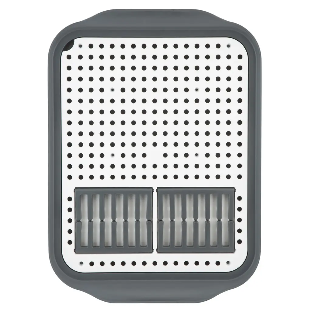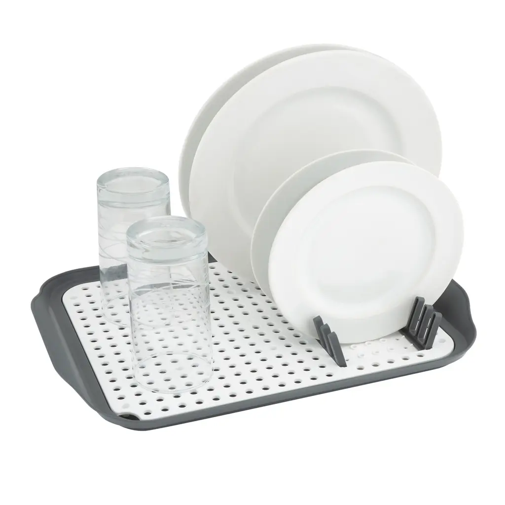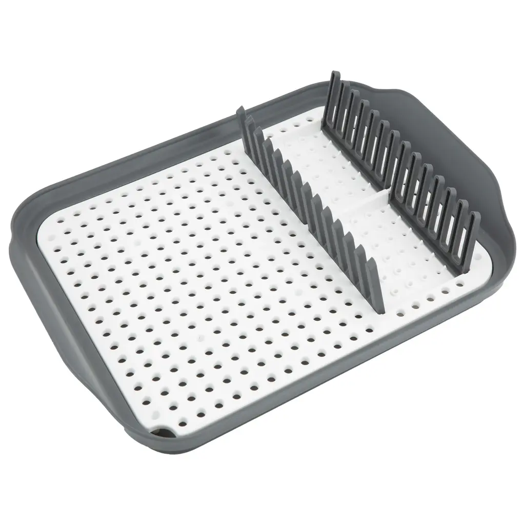 The Kitchen Details easy to store dish rack is the perfect addition for any kitchen. Whether you have a small space or simply do not like to leave your rack on the countertop when not in use, this dish rack serves the purpose. The slim design allows you to store in a cabinet or drawer and self draining feature keeps your counter top mess free. Created with 12 slots for plates and an area to dry cups, cutlery or small pots and pans. Dishwasher safe, you can easily sanitize when needed!