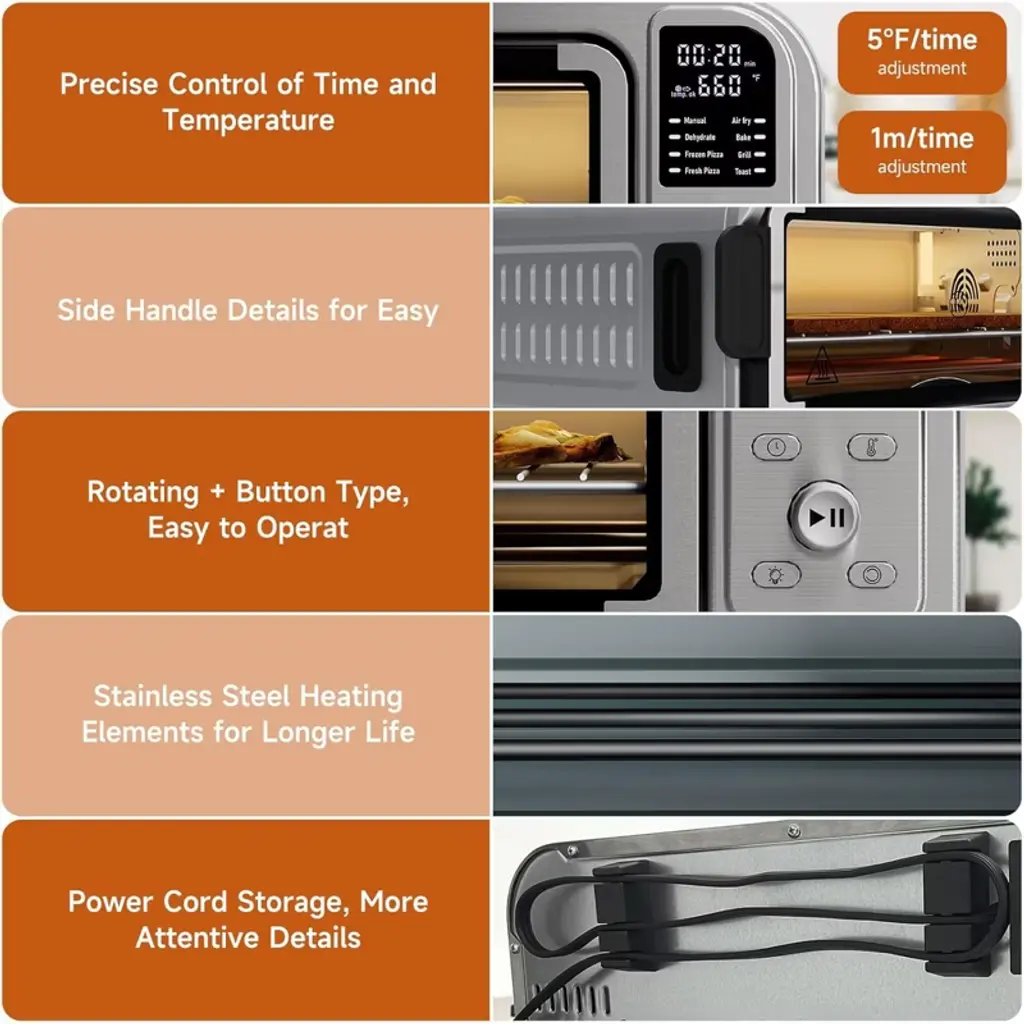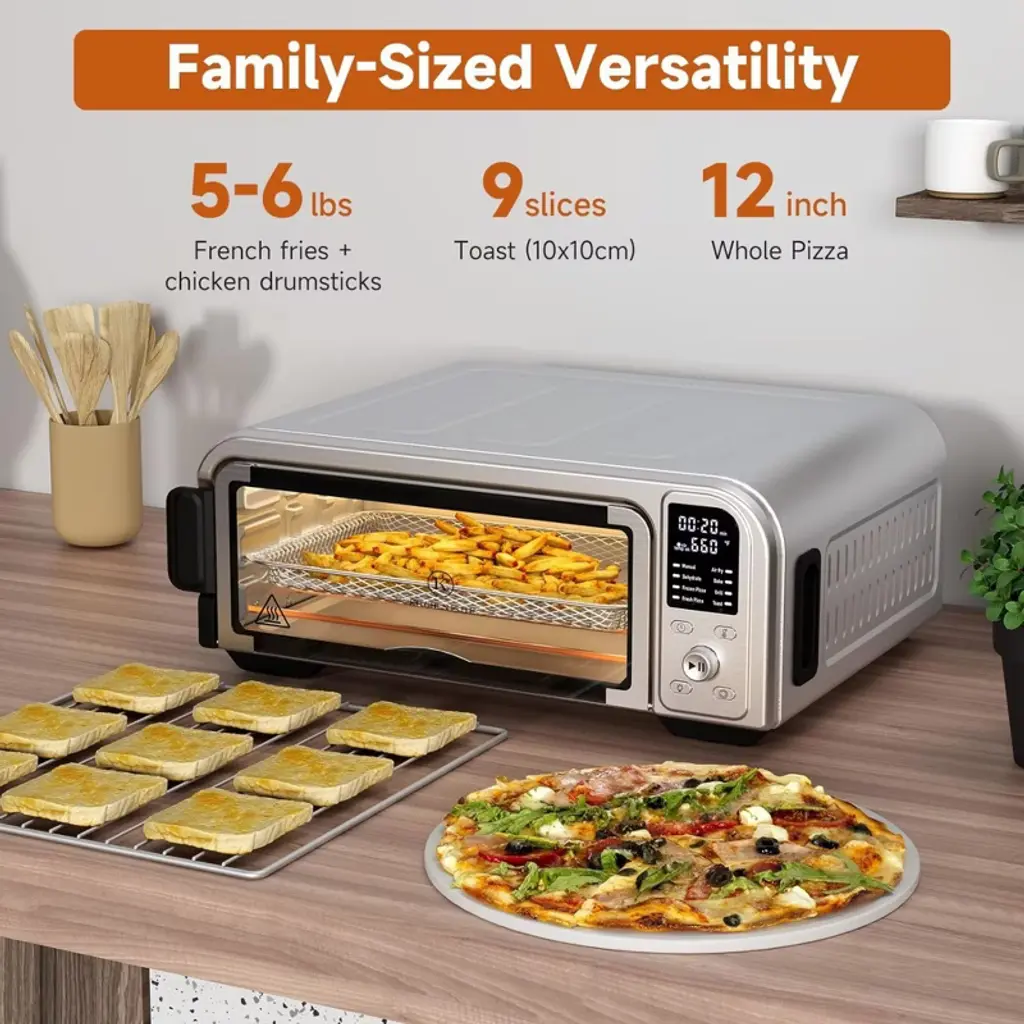 Upgrade your countertop with the Kitchen Elite 18-Liter Digital Air Fryer Toaster Oven Combo, a compact powerhouse designed to bring flexibility and efficiency to your cooking routine. With 8 built-in functions, this comprehensive oven simplifies the way you air fry, bake, grill, or toast, making it perfect for daily meals or quick snacks. Capable of reaching up to 660 degrees Fahrenheit, this oven delivers fast and even cooking performance for a variety of dishes. Whether you're preparing a fresh pizza, reheating leftovers, or crisping vegetables, the built-in presets allow you to cook with precision and ease. The 18-liter capacity holds a 12-inch pizza or 9 slices of toast, giving you the ability to cook more in less time. Crafted with sleek stainless steel and featuring a flip-up vertical design, this toaster oven air fryer combo offers space-saving convenience without sacrificing performance. The interior lights provide excellent visibility while cooking, and the surface is easy to wipe clean after every use. Every detail is made to streamline both prep and cleanup in your kitchen. With 4 included accessories and intuitive digital controls, this convection oven brings professional-grade performance to your home. Whether used for everyday meals or weekend treats, the Kitchen Elite Air Fryer Oven is your go-to appliance for compact, high-power cooking with consistent results every time.