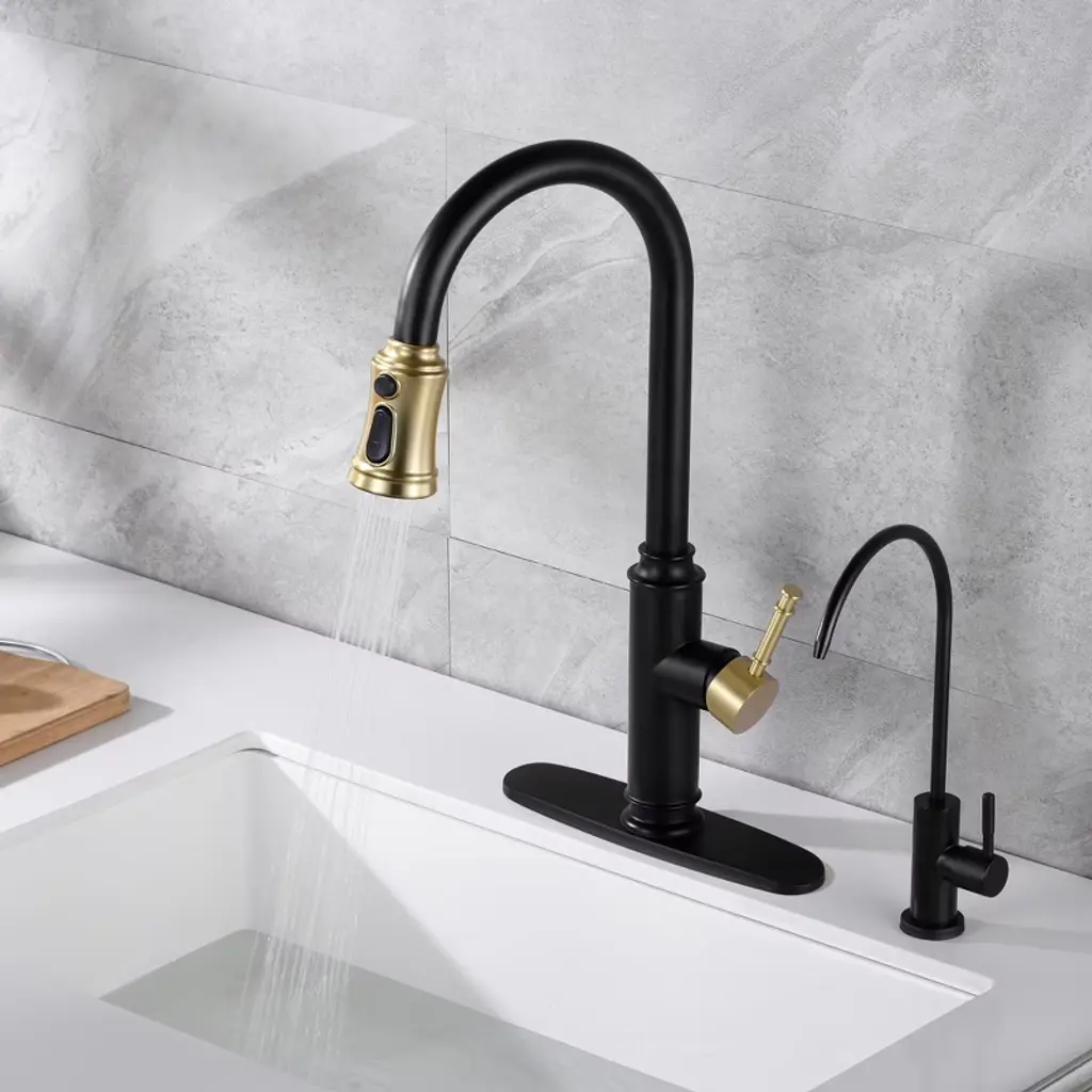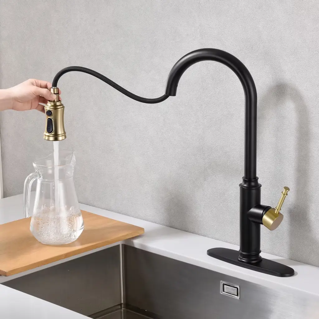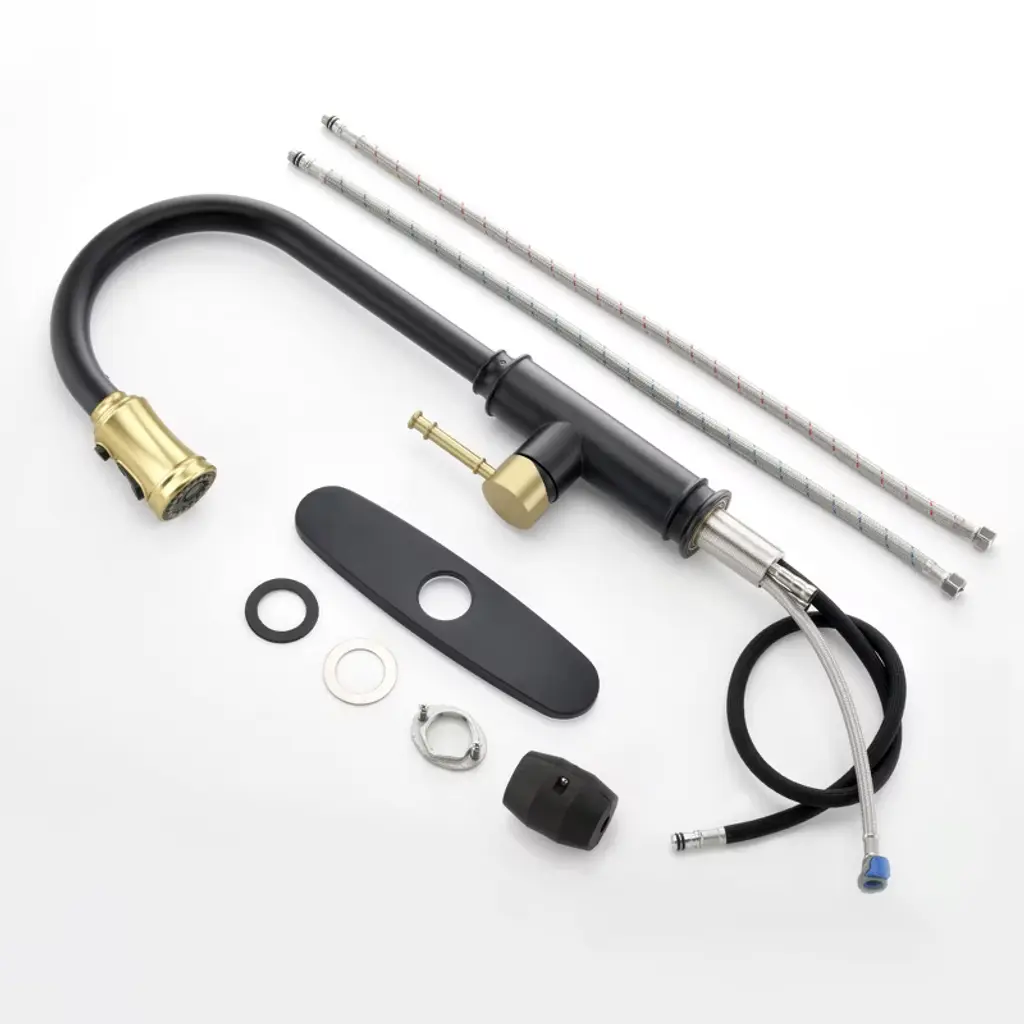 Kitchen Sink Faucet With Pull Down Dual Function Sprayer, High Arc With Deck Plate, Black And Gold