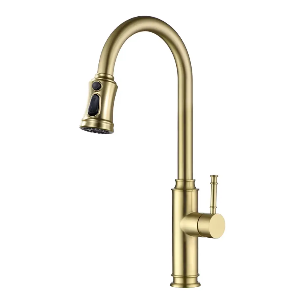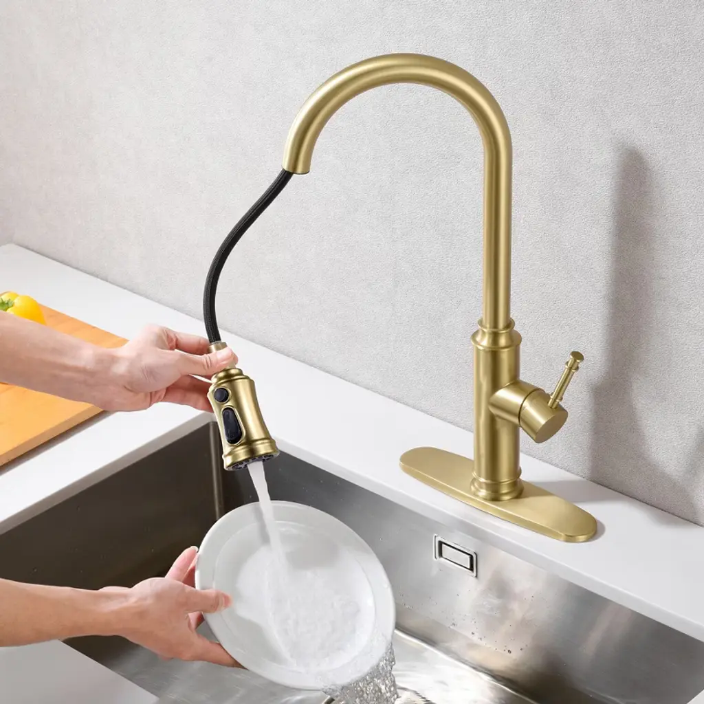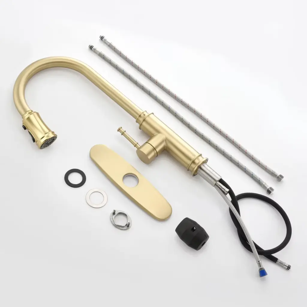 Kitchen Sink Faucet With Pull Down Dual Function Sprayer Single Handle With Deck Plate Brushed Gold