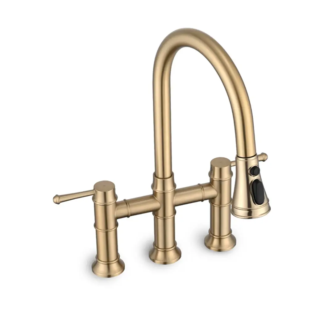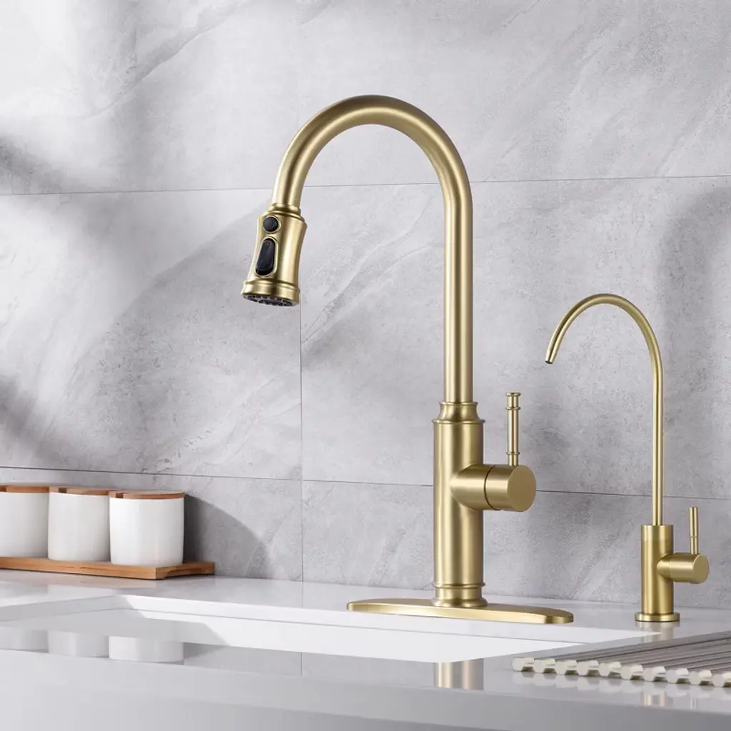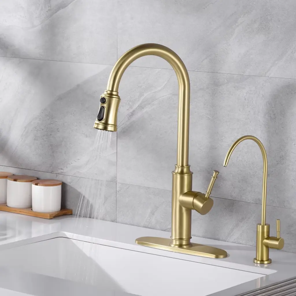 Kitchen Sink Faucet With Pull Down Dual Function Sprayer Single Handle With Deck Plate Brushed Gold
