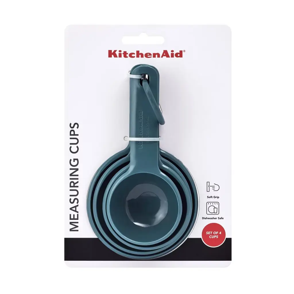 This KitchenAid 4-Piece Measuring Set includes essential tools you need to measure both wet and dry ingredients. The measurements are clearly marked and easy to read, and a ring keeps the cups together for easy storage. Soft grips under the handles maximize comfort and control while using. The set includes: 1/4, 1/2, 1/3, and 1 cup sizes. Dishwasher safe.
