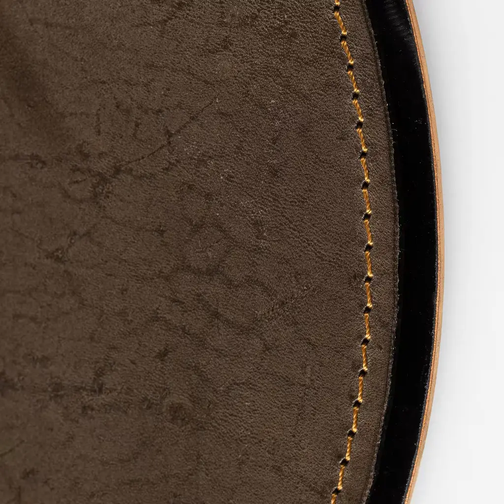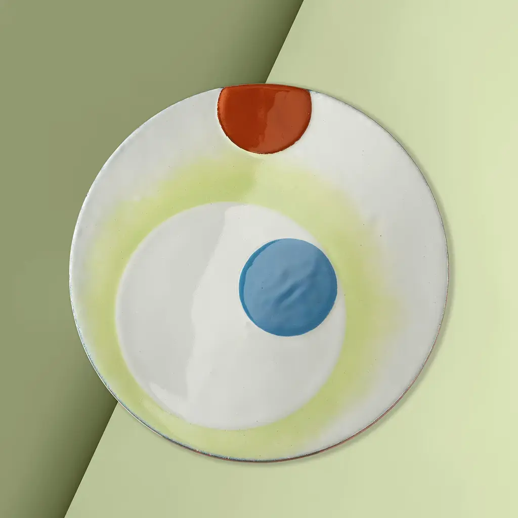 Collection of decorative plates made using the technique of fire enamel on copper. The colors and motifs come from a visit to the Guggenheim Museum in New York, while the technique is a tribute to Italian design from the 1950s, 1960s, and 1970s. The back is enameled and covered in hand-stitched dark brown leather.