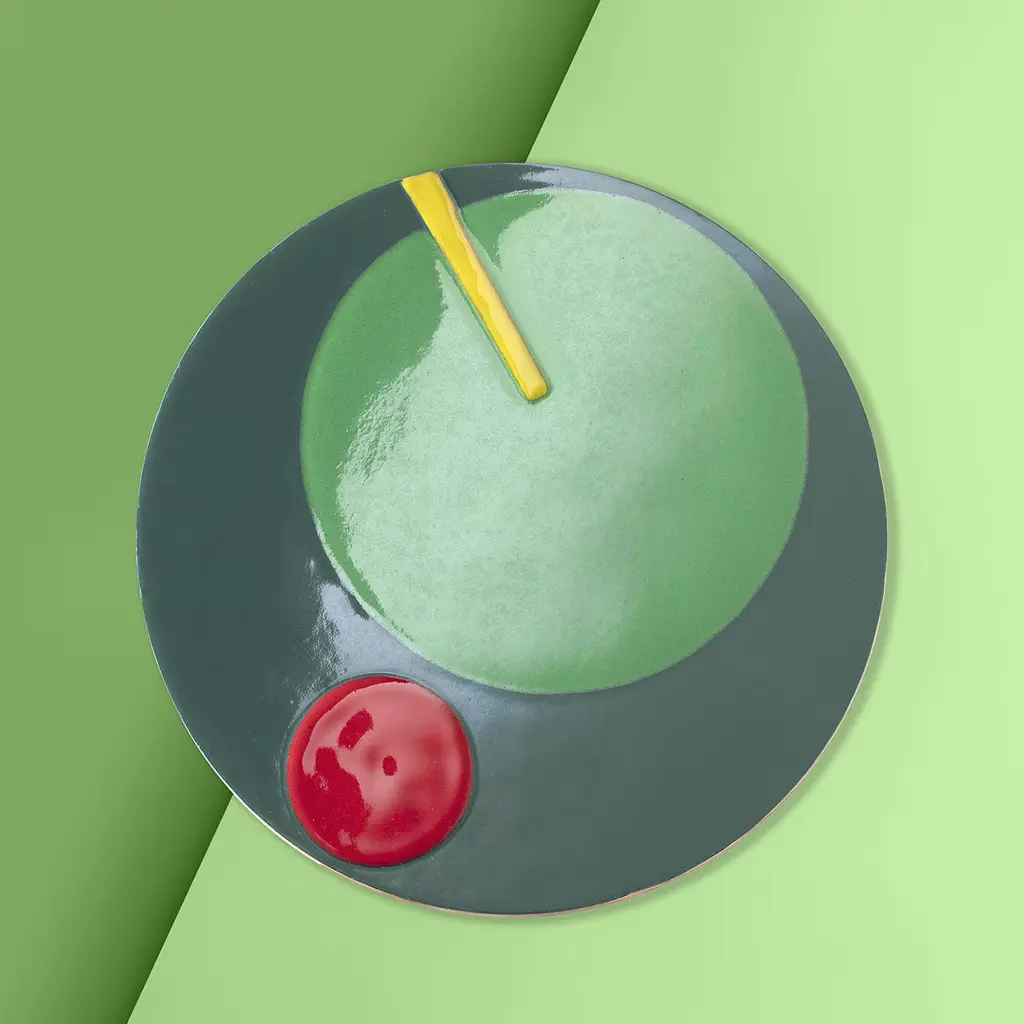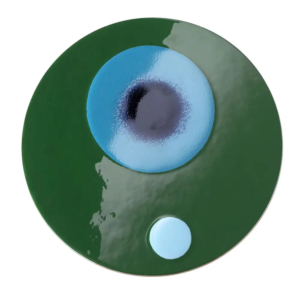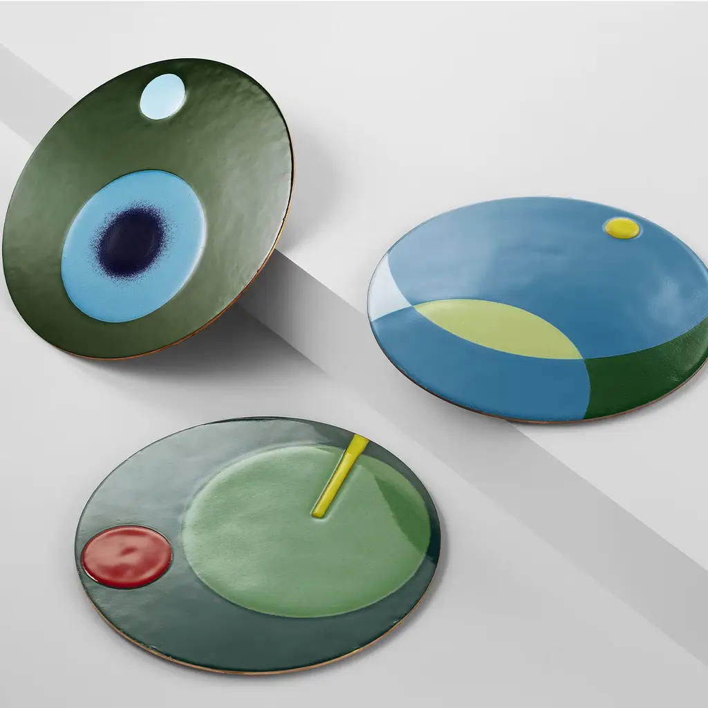 Collection of decorative plates made using the technique of fire enamel on copper. The colors and motifs come from a visit to the Guggenheim Museum in New York, while the technique is a tribute to Italian design from the 1950s, 1960s, and 1970s. The back is enameled and covered in hand-stitched dark brown leather.