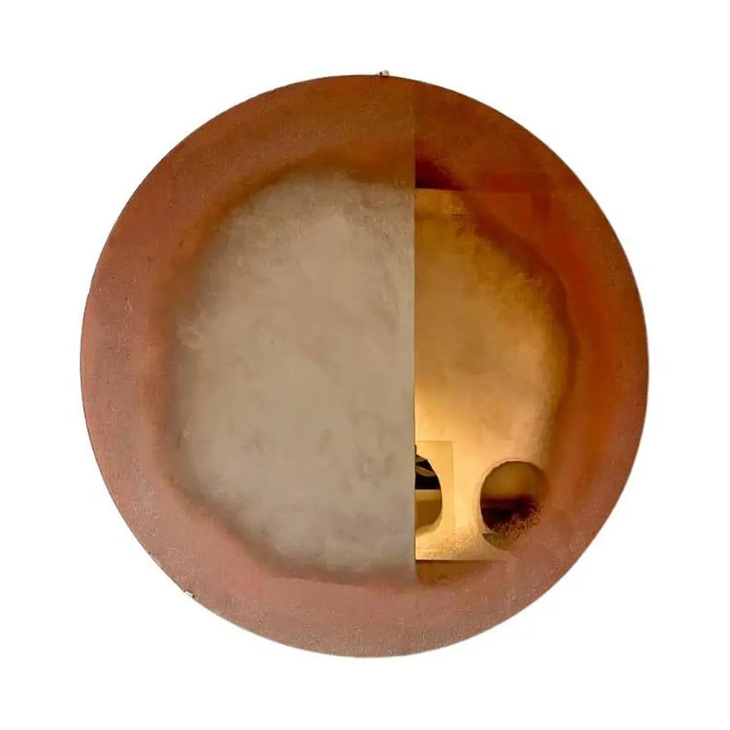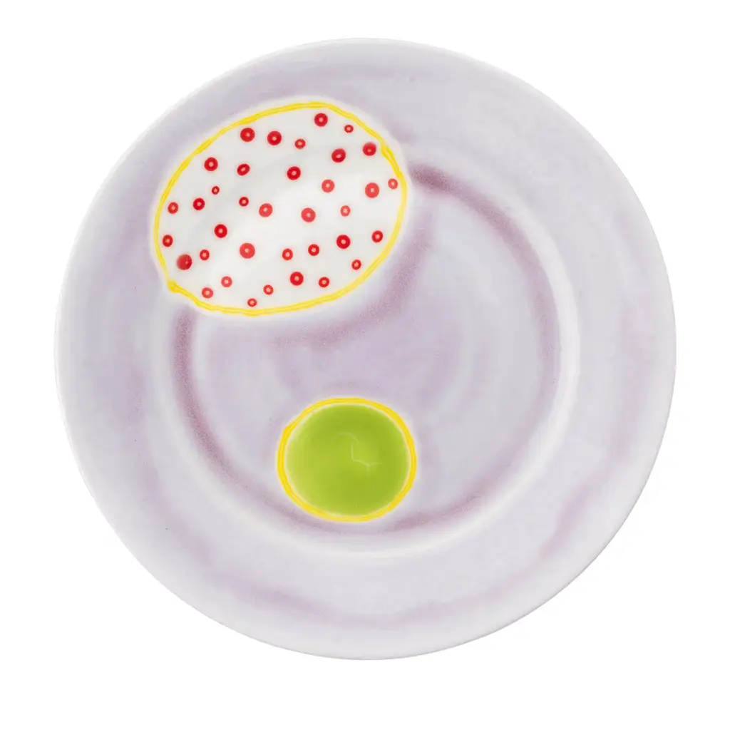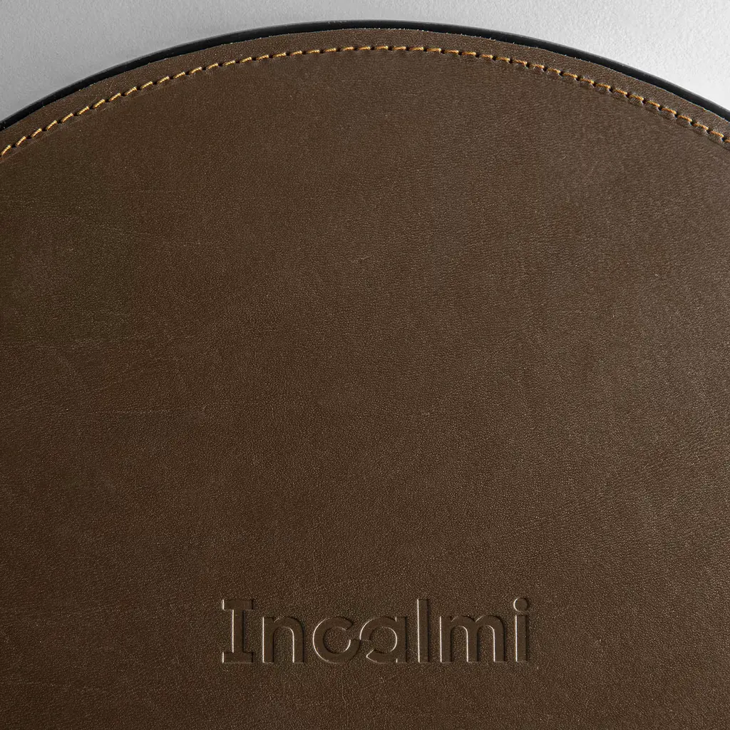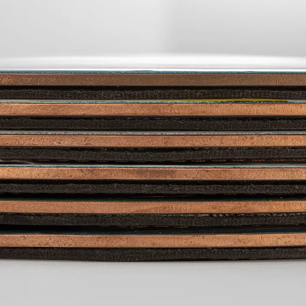Collection of decorative plates made using the technique of fire enamel on copper. The colors and motifs come from a visit to the Guggenheim Museum in New York, while the technique is a tribute to Italian design from the 1950s, 1960s, and 1970s. The back is enameled and covered in hand-stitched dark brown leather.