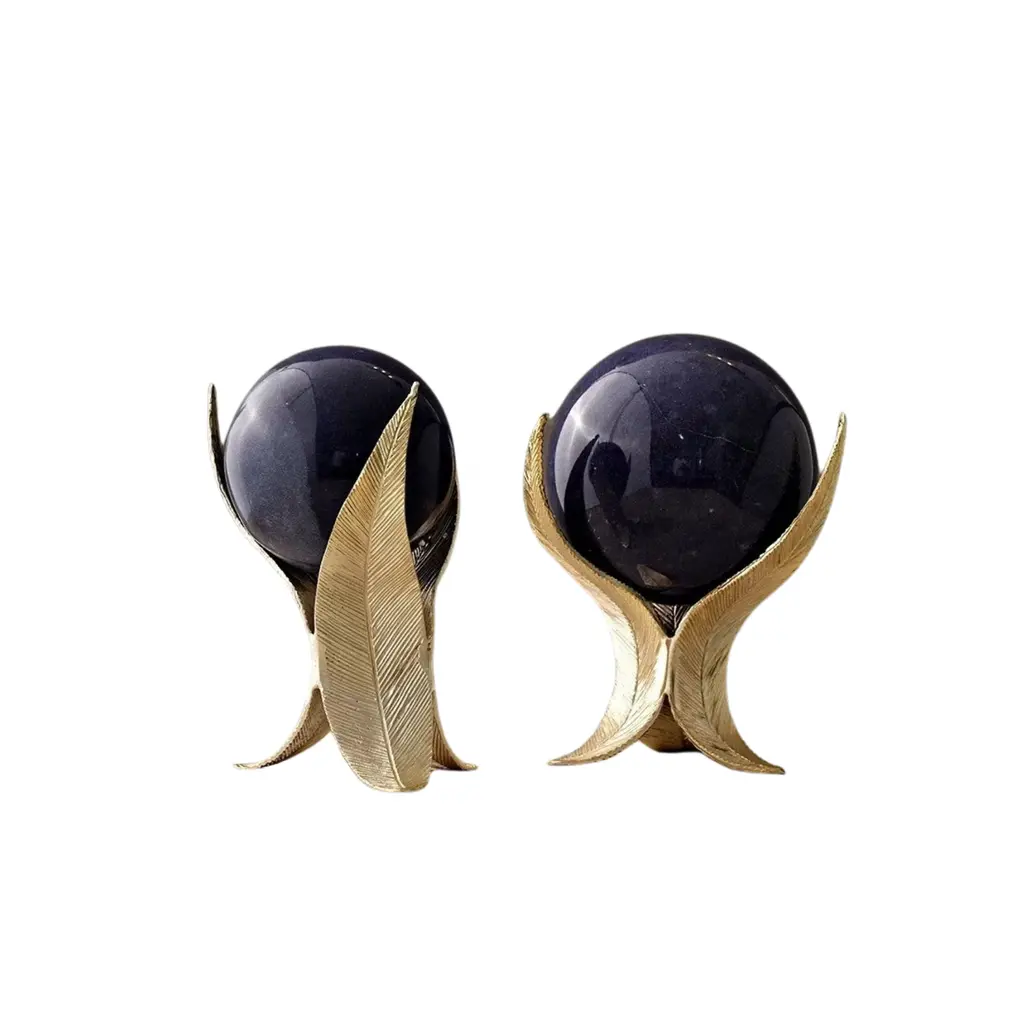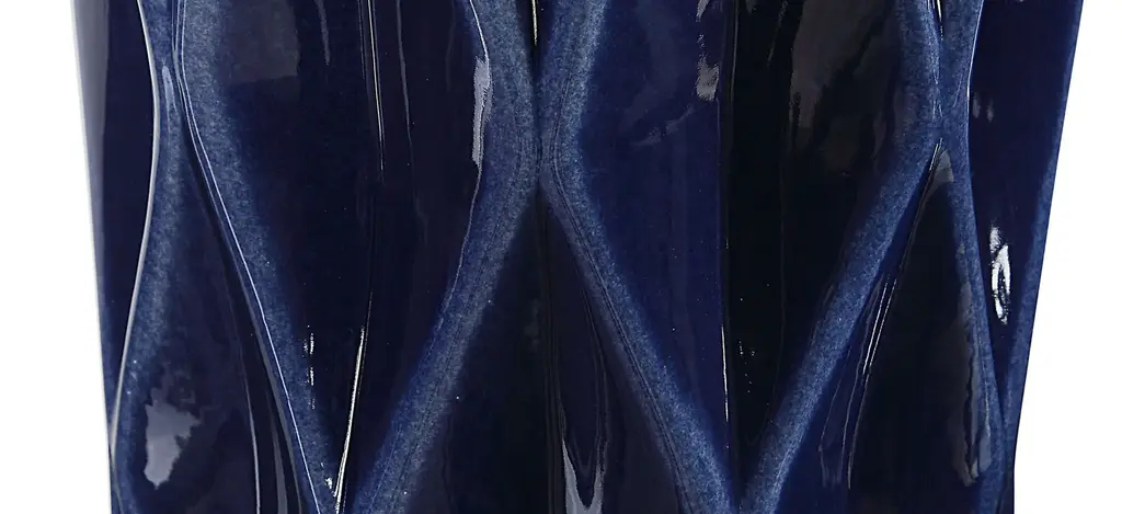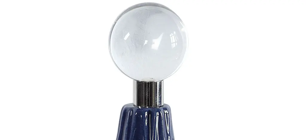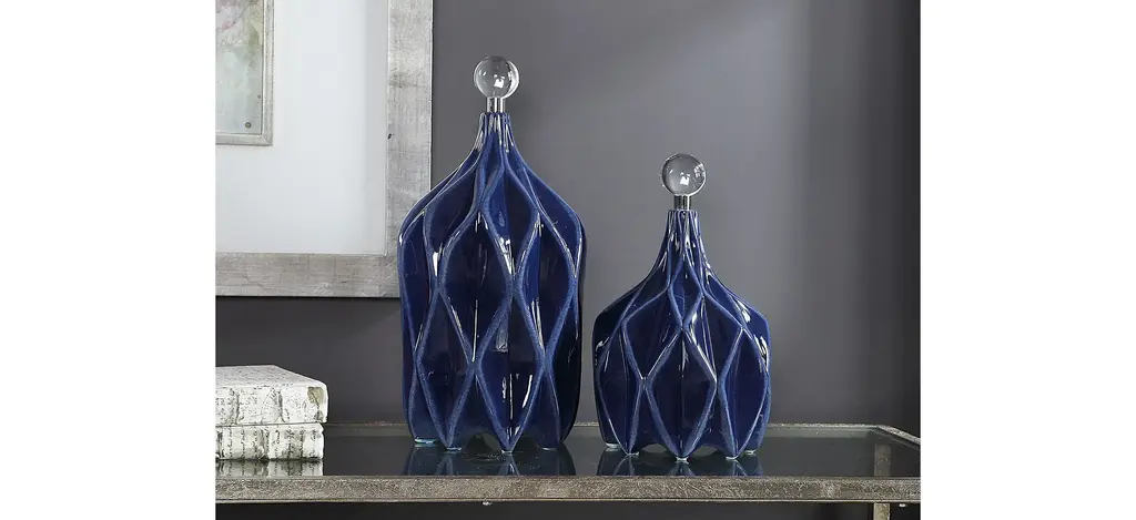 Modern style emanates from this set of decorative ceramic bottles with an embossed geometric pattern finished in a glossy cobalt blue and accented with polished nickel and crystal finials. Sizes: Small-8x13x8, Large-8x17x8