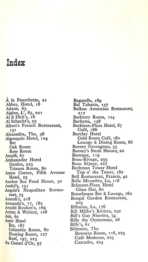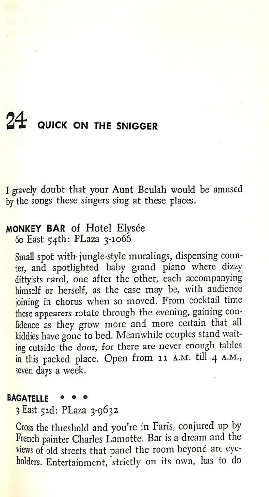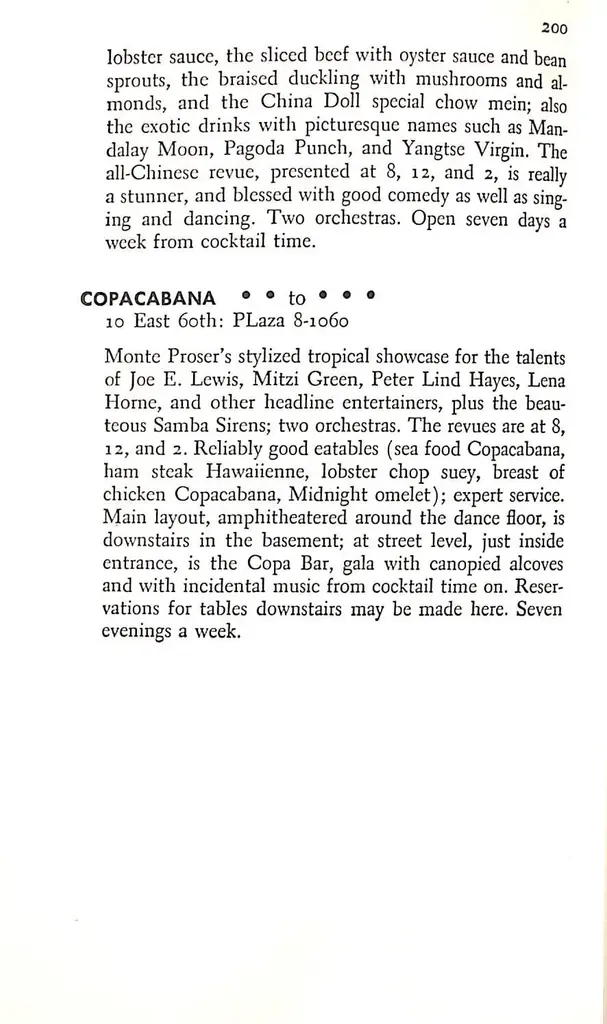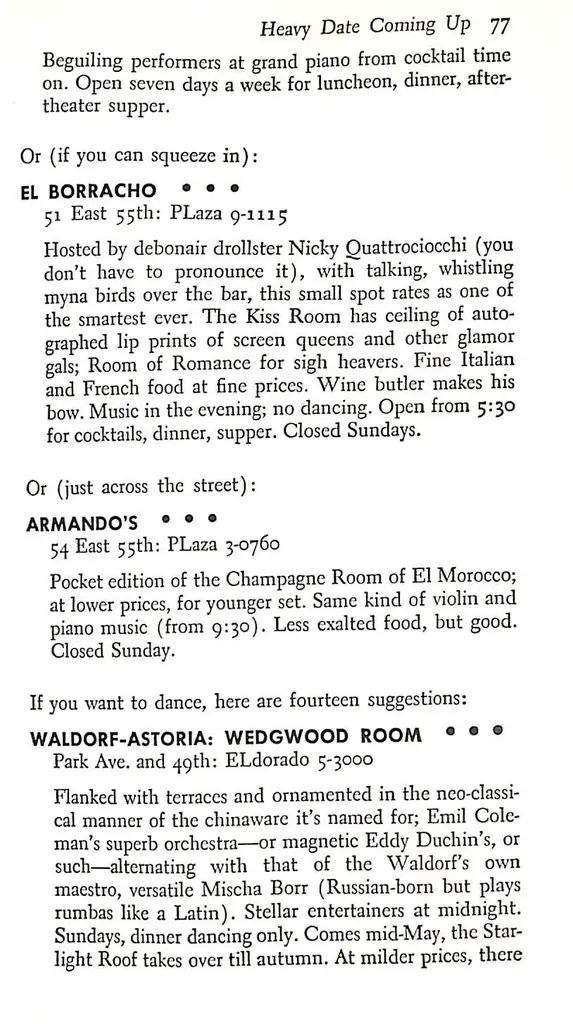 MACKALL, Lawton [245] pp. Doubleday & Company, Inc. 1949 Second Edition 7 5/8" x 5" Jacket design by Titta Vaubel The Stork Club, El Morocco, the Colony, Quo Vadis, 21, and Sardi’s are just a few of the restaurants and nightclubs included in this mid-20th Century profile of the New York dining scene. The author was a food enthusiast who wrote for Vanity Fair and Esquire. Depending on the restaurant, the format varies, but on the more prominent venues, there is as much dish on the clientele as there is on the dishes served. The flavor of midcentury New York is throughout. “If your grandfather owned a few banks, a couple of railroads, and maybe a chain of stores or a shipping line, [El Morocco] is where you’ll be spending your evenings.” --Lawton Mackall