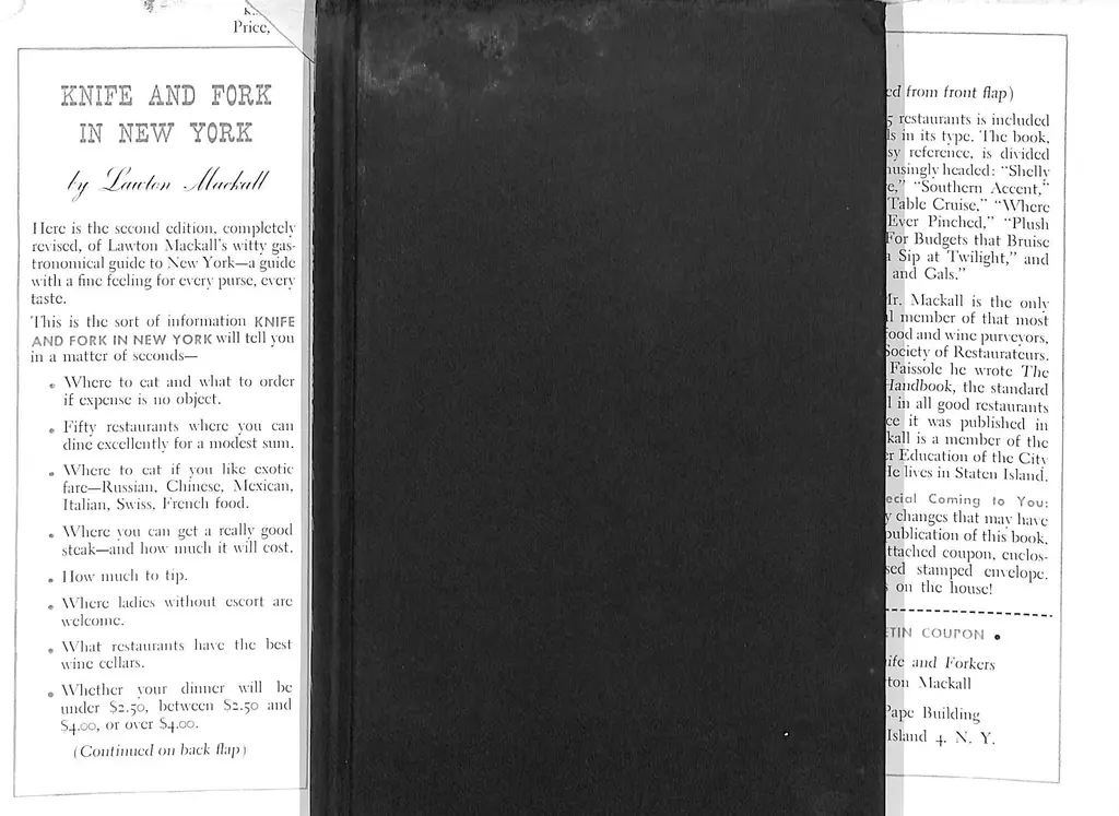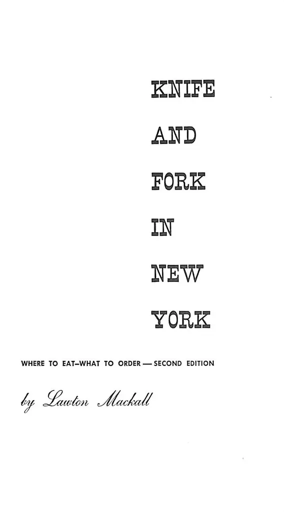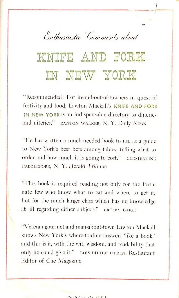 "Knife And Fork In New York: What To Eat What To Order" 1949 Mackall, Lawton