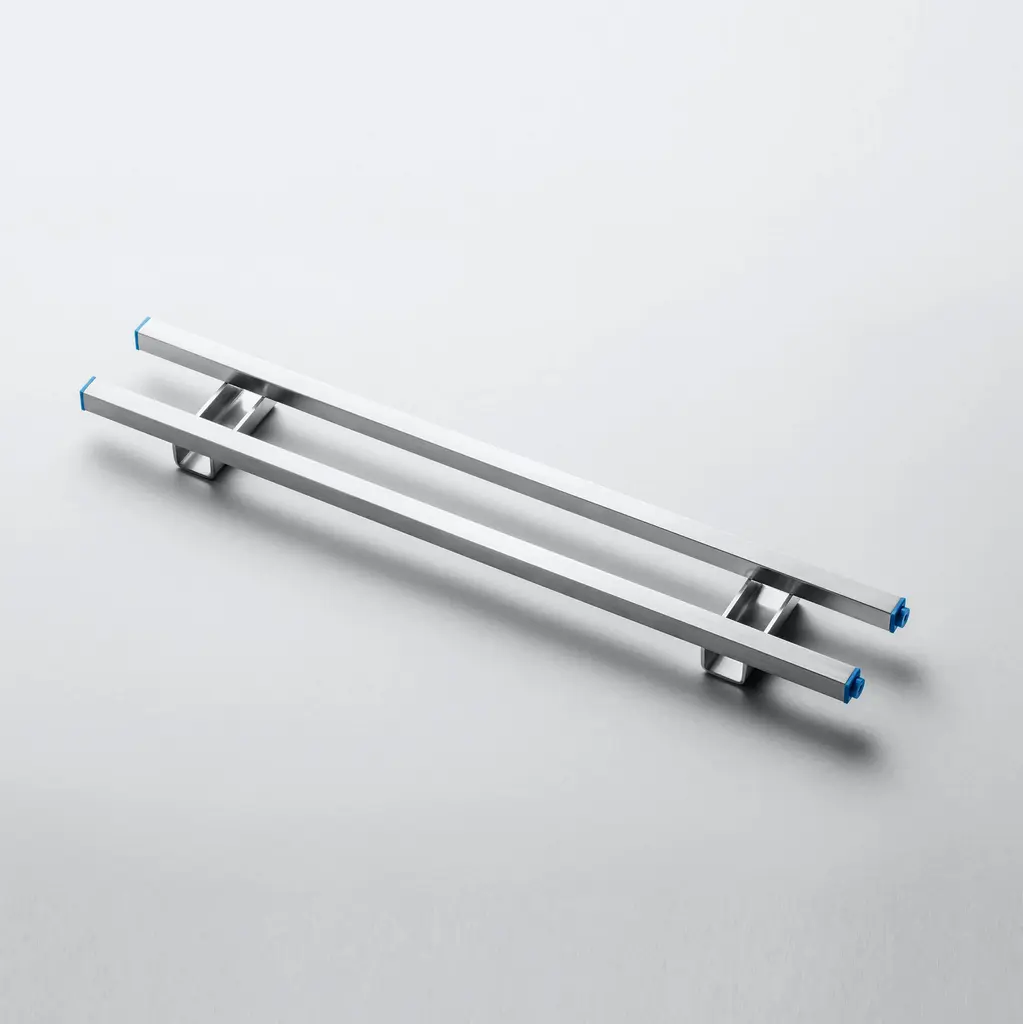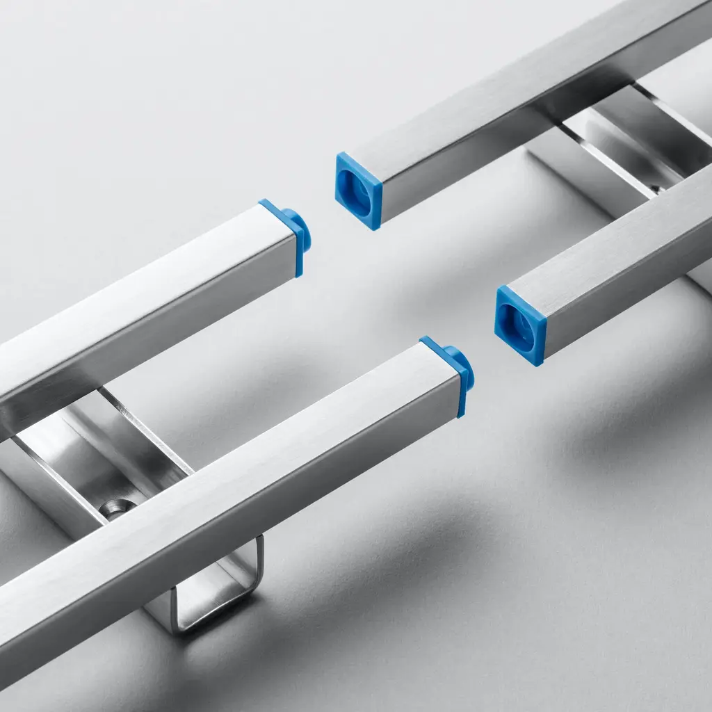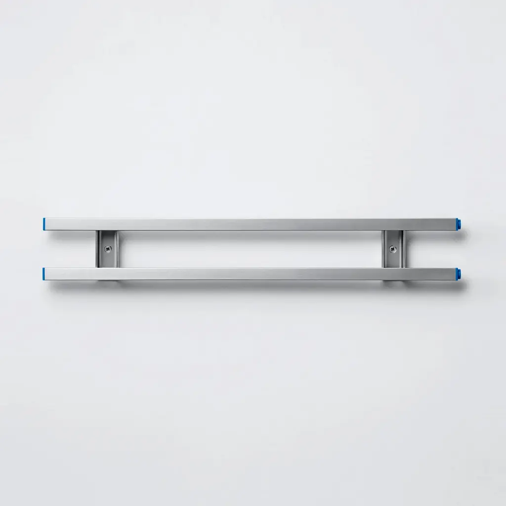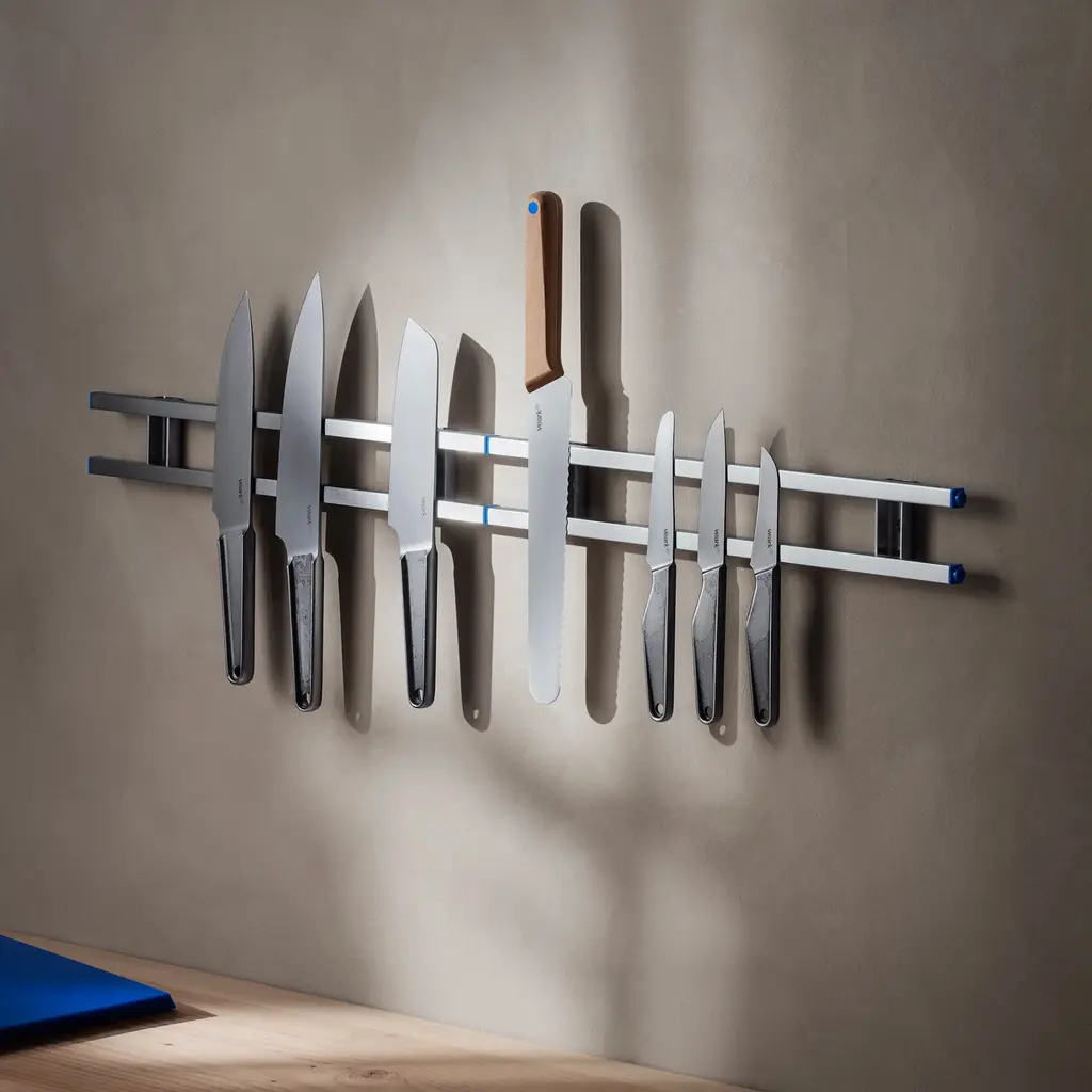 Create the perfect storage and display rack for your favorite kitchen utensils with the Veark Magnetic Rack. Made with a modular design that takes inspiration from professional kitchens, this knife magnet rack allows you to combine several sections, if you need more room for extra knives or other tools. The magnet keeps items firmly in place and proudly on display. Additionally, this modular magnetic rack features four hooks that provide space for other items and accessories like pots, pans, kitchen towels, or baking mittens. Crafted from stainless steel, the knife rack is both lightweight and easy to clean. It also boasts a brushed finish and bright blue connectors that give the design an industrial character.
