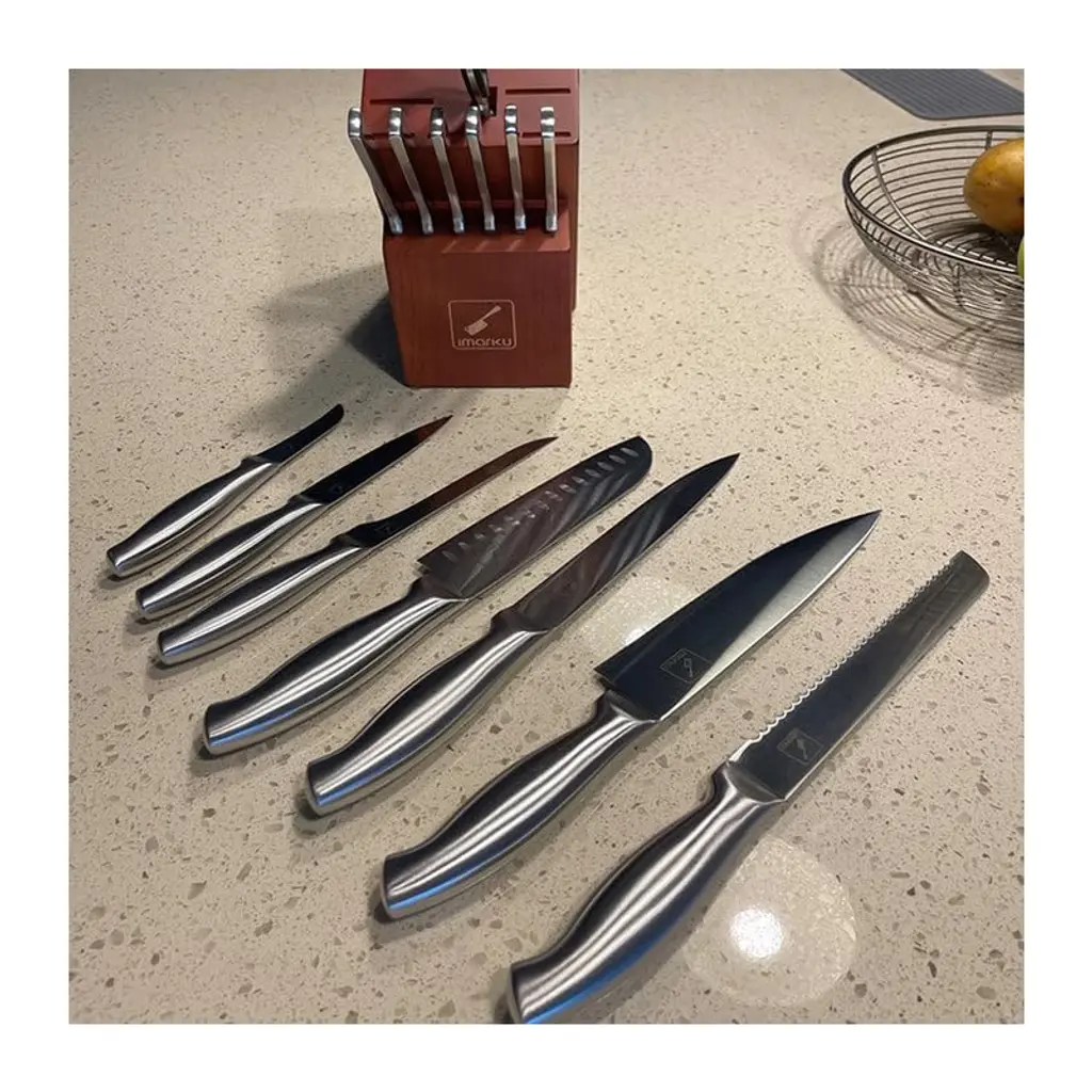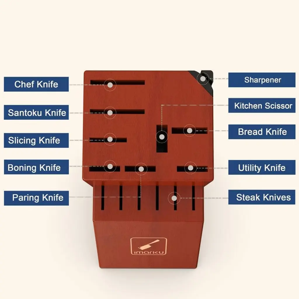 Knife Set with Built-in Sharpener: Our knife block set features a smart design with a built-in knife sharpener for added convenience. We have thoughtfully inclined the sharpening position, addressing the common issue of interference from other knives when using a vertical sharpener. With this feature, you can effortlessly sharpen your knives without any hindrances, making this set a must-have for your kitchen Premium Quality Knives Set for Kitchen: Indulge in our meticulously crafted knives set, made from high carbon German stainless steel for unrivaled durability. Designed with professional-grade construction and a lightweight design, these knives deliver superior performance in the kitchen. The full tang blades ensure exceptional strength, sharpness, and long-term reliability, making them a reliable companion for all your culinary endeavors Effortless Upkeep for Your Kitchen Knife Set: Our knife set for kitchen with a durable block is engineered for easy maintenance and cleaning. The knife block, expertly crafted from processed logs, provides a sturdy and long-lasting solution that prevents shrinking. Simply wash the knives and block, ensure thorough drying, and store them in a dry place. With our convenient knife set with block, maintaining a pristine kitchen has never been simpler Choose the Professional Knife Set: With this 15-piece knife set, you have all the options you need to find the perfect knife for every kitchen task. Whether you're slicing, dicing, or chopping, our set offers a wide variety of knives designed to meet your specific needs. Including: Boning knife*1, Santoku knife*1, Bread knife*1, Paring knife*1, Utility knife*1, Slicing knife*1, Chef knife*1, Knife block*1, Steak knife*6 Professional Customer Service Support: Enjoy peace of mind with our hassle-free returns and lifetime warranty. We are committed to your satisfaction. If you have any questions or inquiries, please don't hesitate to reach out to us, and our dedicated team will promptly assist you. It is a wise choice for holiday gifts to culinary students, home cooks, professional chefs, etc
