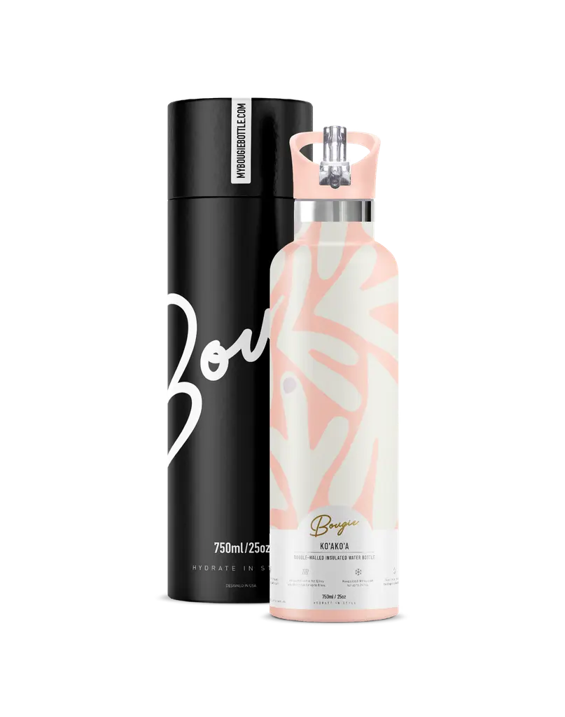 Introducing the Coral Reef Design Ko'ako'a 25oz Insulated Water Bottle from My Bougie Bottle. This bottle features a vibrant coral-colored backdrop with a modern design, inspired by the stunning beauty of Hawaiian coral reefs. It’s the perfect blend of style and functionality for ocean lovers.