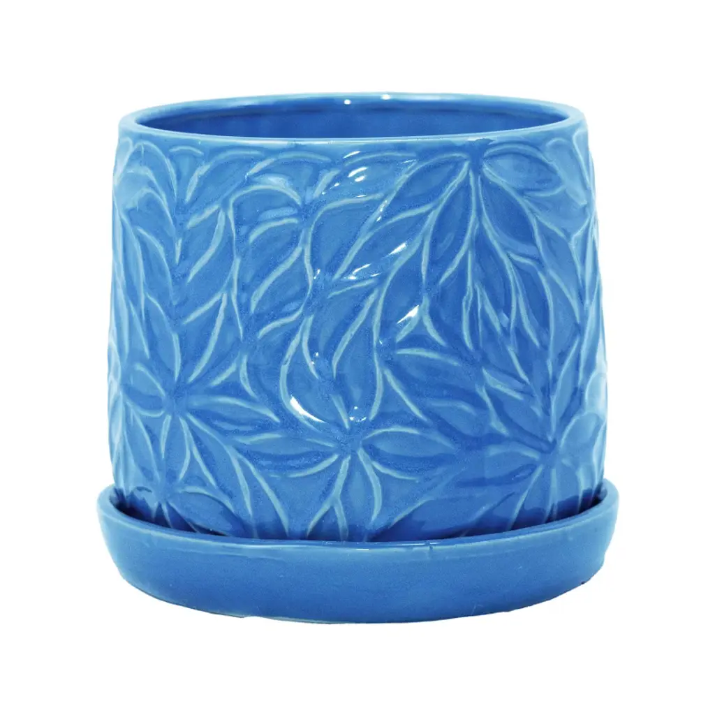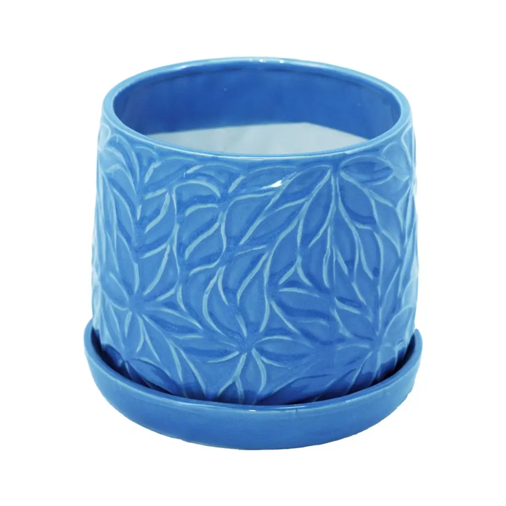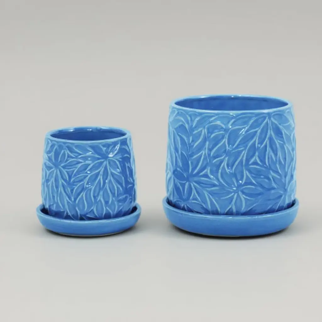 Ktmbdw Ceramic Planter Pot Set Of 2, Modern Flowerpot With Drainage Hole And Saucer, Embossed Leaf Design Flowerpot For Patio, Garden, Blue