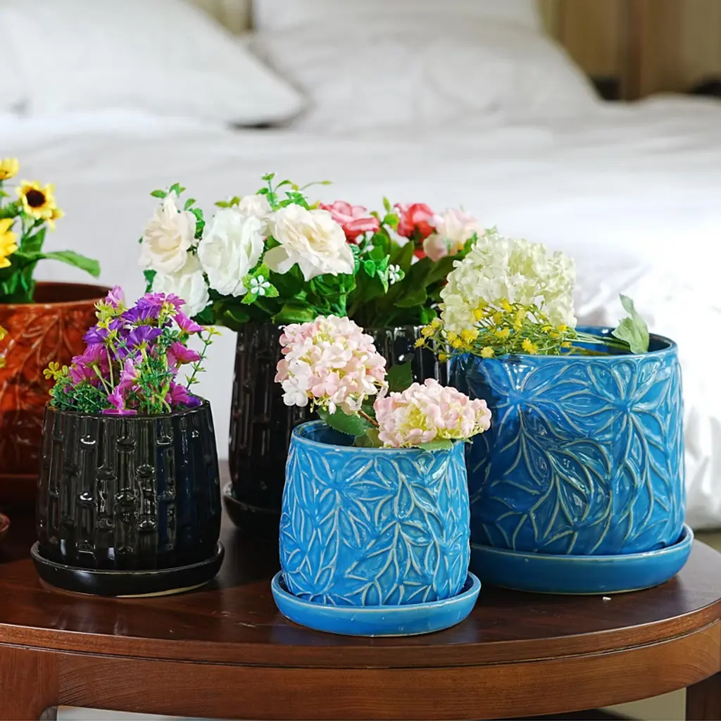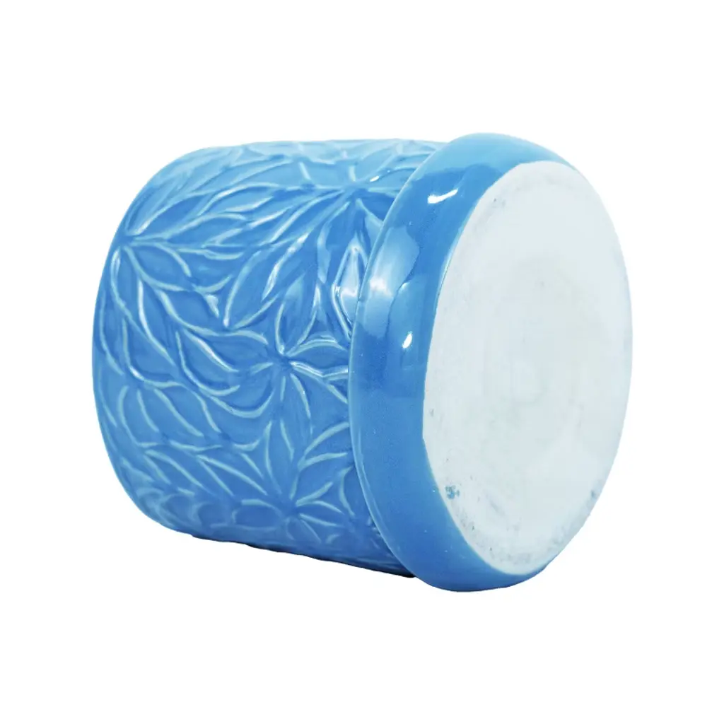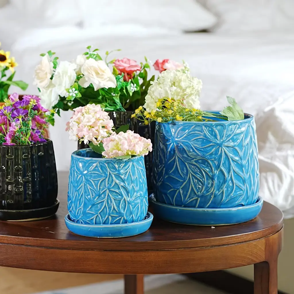 Ktmbdw Ceramic Planter Pot Set Of 2, Modern Flowerpot With Drainage Hole And Saucer, Embossed Leaf Design Flowerpot For Patio, Garden, Blue