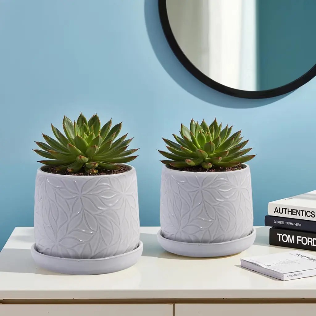 Elevate your greenery with our 2 Pieces Ceramic Planter Pot, a modern and versatile flowerpot designed for both indoor and outdoor spaces. Crafted from high-quality, reinforced ceramic with a beautiful gloss white finish and an elegant embossed leaf design, this planter adds a chic touch to any decor.