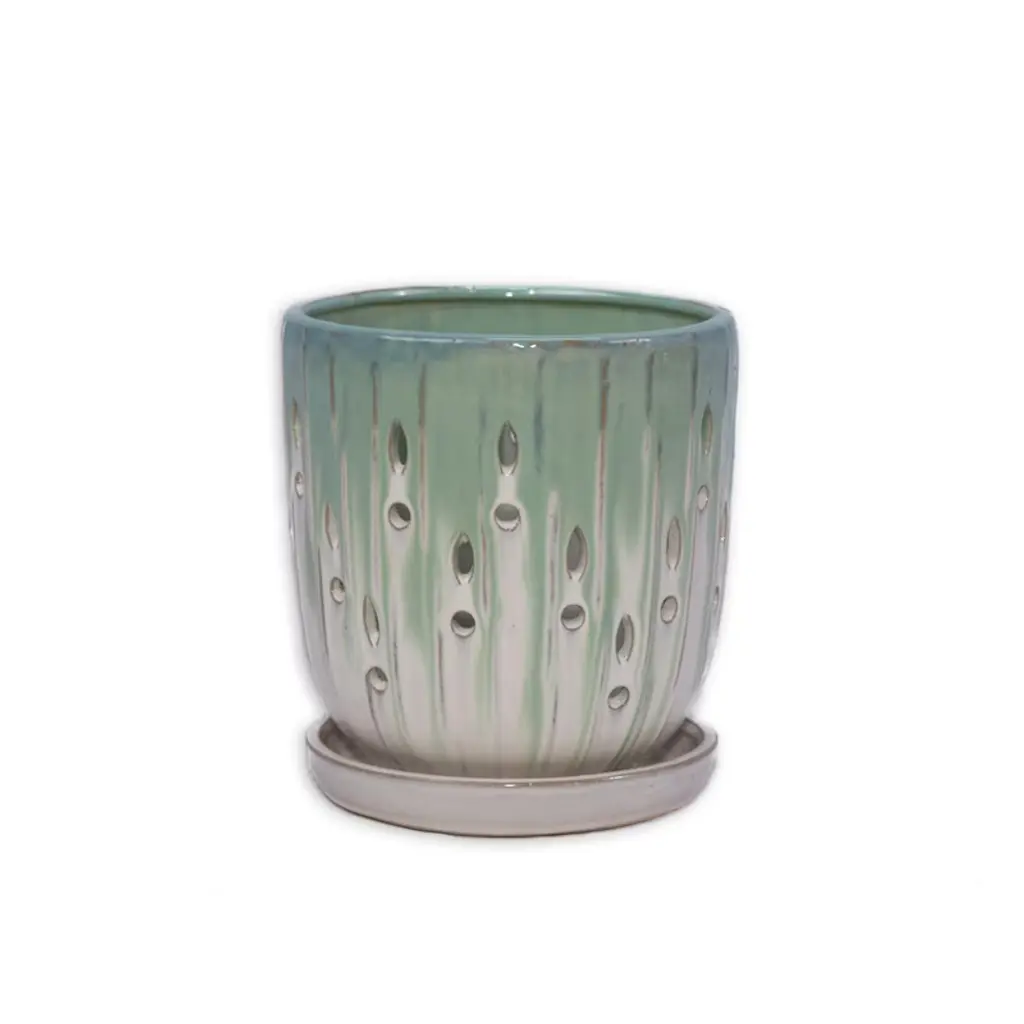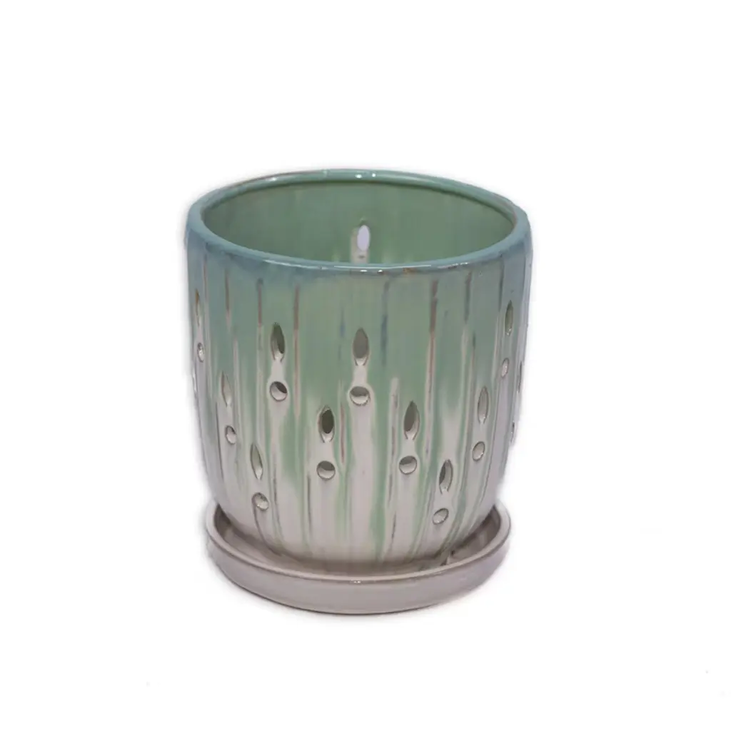 Ktmbdw Ceramic Planter Set Of 2 With Drainage Hole And Saucer For Plants, Hollow & Striped Design Ceramic Flowerpot For Patio, Garden, Green