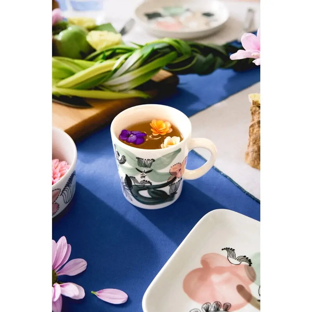Arabia's Kukkamaa plate is adorned with a joyful design by artist Armi Teva, where whimsical characters peek through blossoming plants. The hand-drawn lines and dynamic brushstrokes capture the fresh and hopeful energy of spring in full bloom. The Kukkamaa collection is part of the Beloved Patterns series that celebrates Arabia’s timeless designs from the past and present. With its clean shapes and ever-evolving, enchanting patterns, the series weaves together echoes of history and stories yet to come, bringing charm and character to all kinds of table settings.