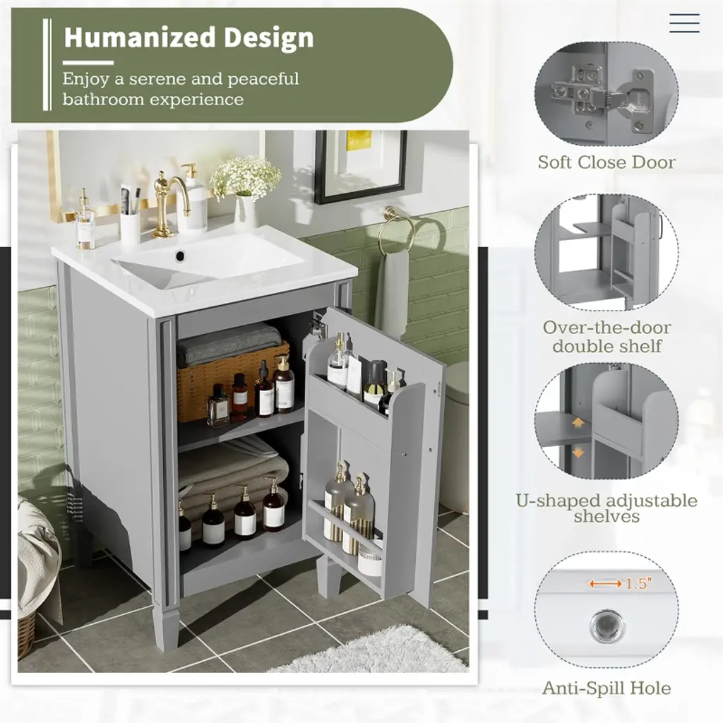 This 20" modern vanity, with its sleek finish and easy-to-clean porcelain sink, will brighten your bathroom. It features a thoughtfully designed U-shaped adjustable shelf and double shelves in the door, cleverly organizing everyday essentials without taking up extra space. Clean lines and a silent, soft-close door add a touch of elegance and tranquility to your daily life. It's perfect for small bathrooms where beauty and functionality are key.
