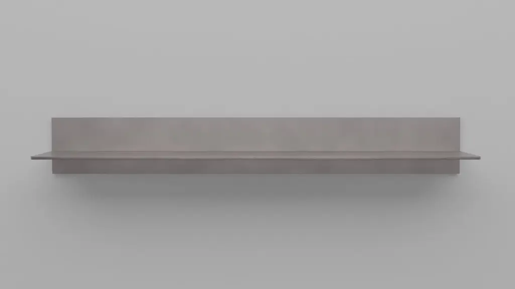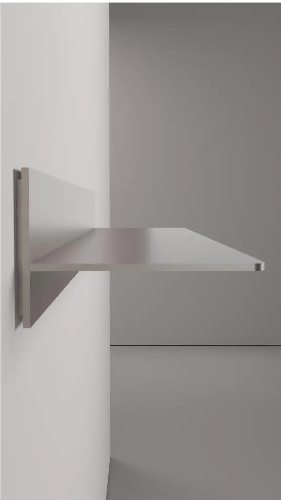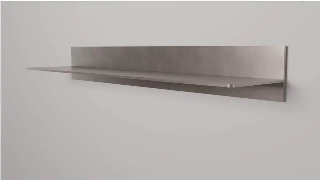 L-wall shelf in half inch thick aluminum plate. Digitally cut aluminum plates intersect and are fused with recessed welds that are ground smooth. Plates are hand finished and waxed. Included are custom, steel wall cleats with instructions for simple mounting.