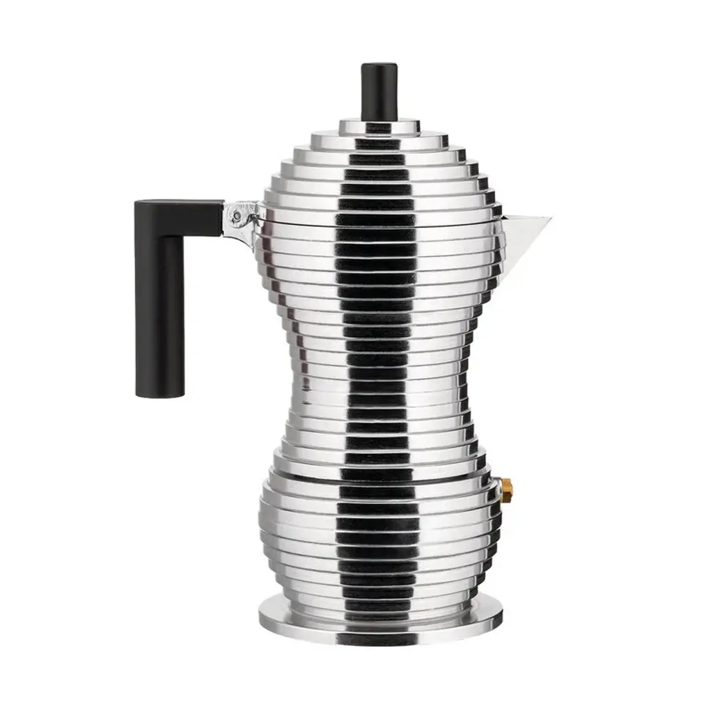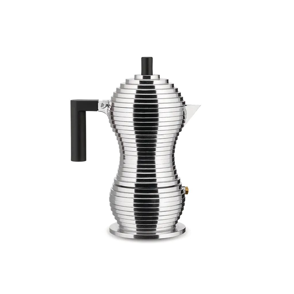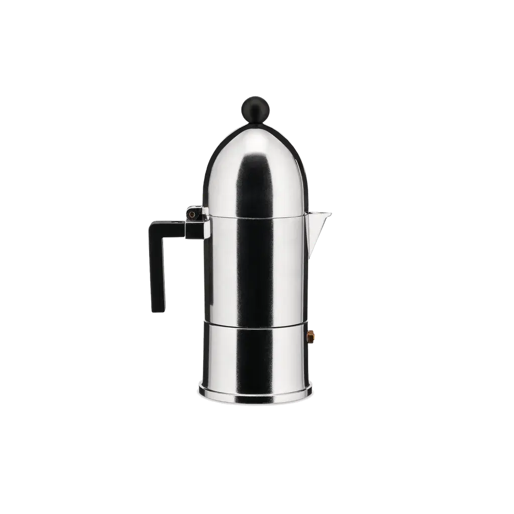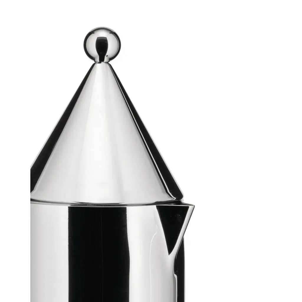 Alessi’s La Conica espresso coffee maker, designed by Italian architect Aldo Rossi in the 1980s, is sure to make a statement in the kitchen and any table setting. La Conica’s elegant appearance is a combination of three geometric elements: a sphere, a cone and a cylinder. The name La Conica refers to the conical lid. The 6-cup La Conica espresso coffee maker is made from stainless steel with a copper base.