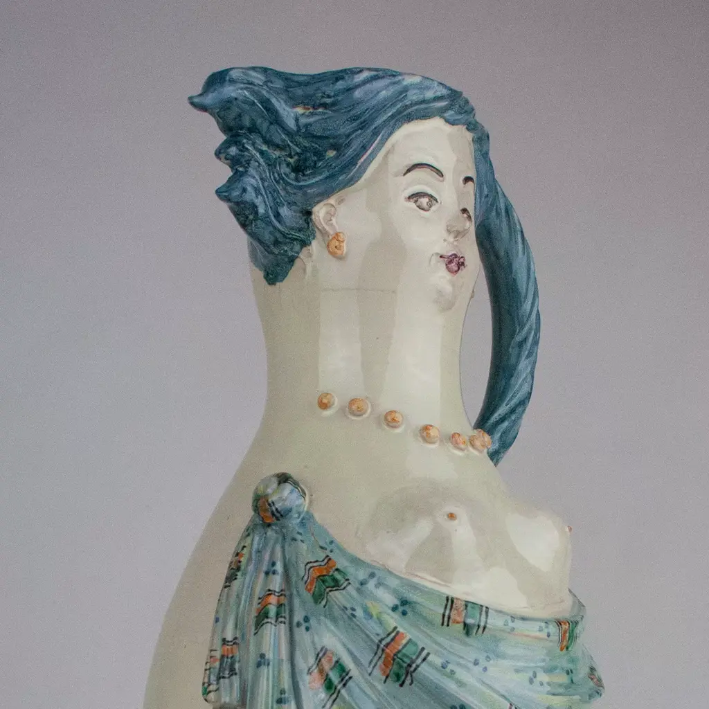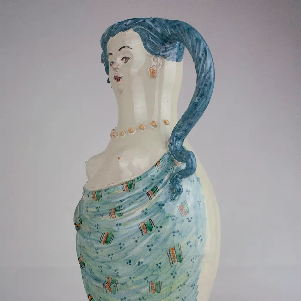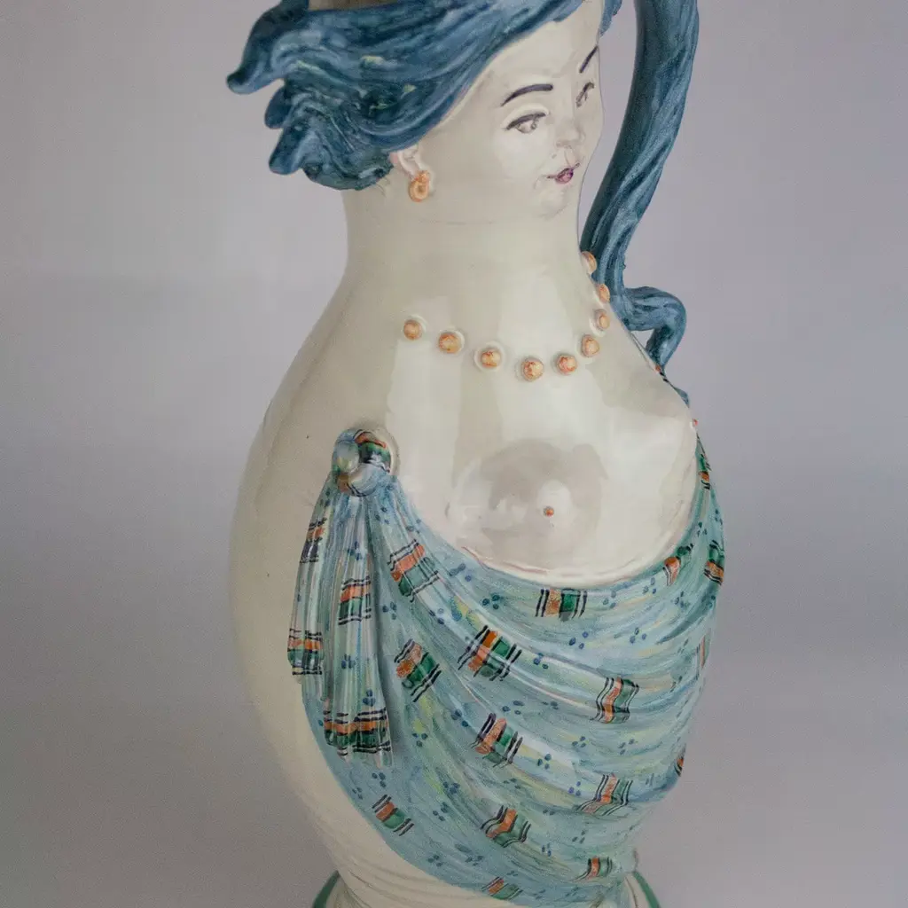 Skillfully rendering in delicate detail the image of a maitresse, this unique pitcher is part of a series of anthropomorphic pieces that will enliven a modern table with exquisite elegance. This one-of-a-kind object of functional decor is crafted of ceramic on the lathe and painted by hand with soft blue shades around the pale skin of the woman who has a strong but smiling expression and proudly displays her breasts above her tunic. A strand of her blue hair creates the handle of the pitcher and pale yellow accents depict her rich jewelry.