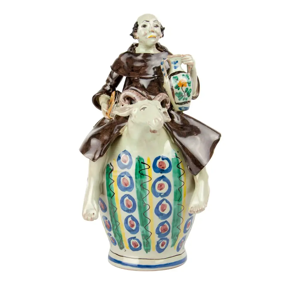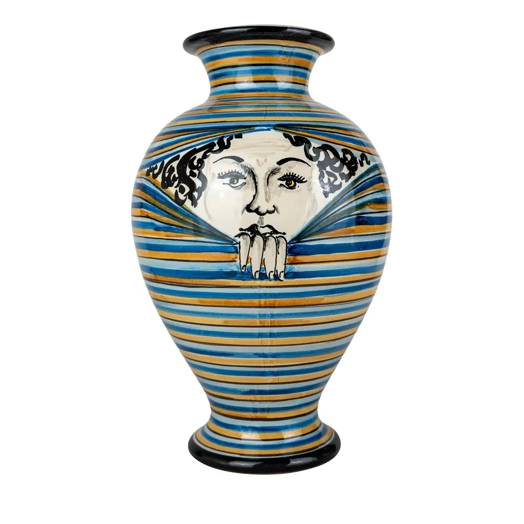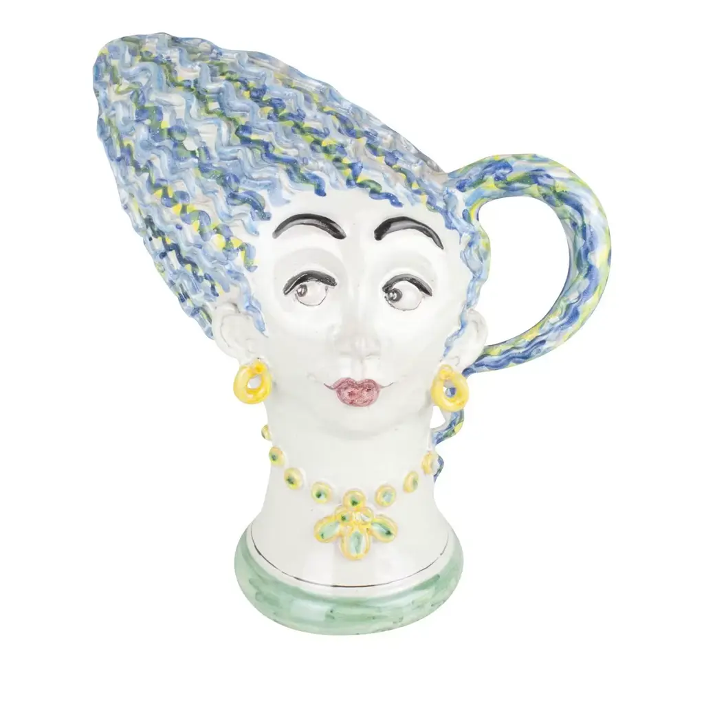 Skillfully rendering in delicate detail the image of a maitresse, this unique pitcher is part of a series of anthropomorphic pieces that will enliven a modern table with exquisite elegance. This one-of-a-kind object of functional decor is crafted of ceramic on the lathe and painted by hand with soft blue shades around the pale skin of the woman who has a strong but smiling expression and proudly displays her breasts above her tunic. A strand of her blue hair creates the handle of the pitcher and pale yellow accents depict her rich jewelry.
